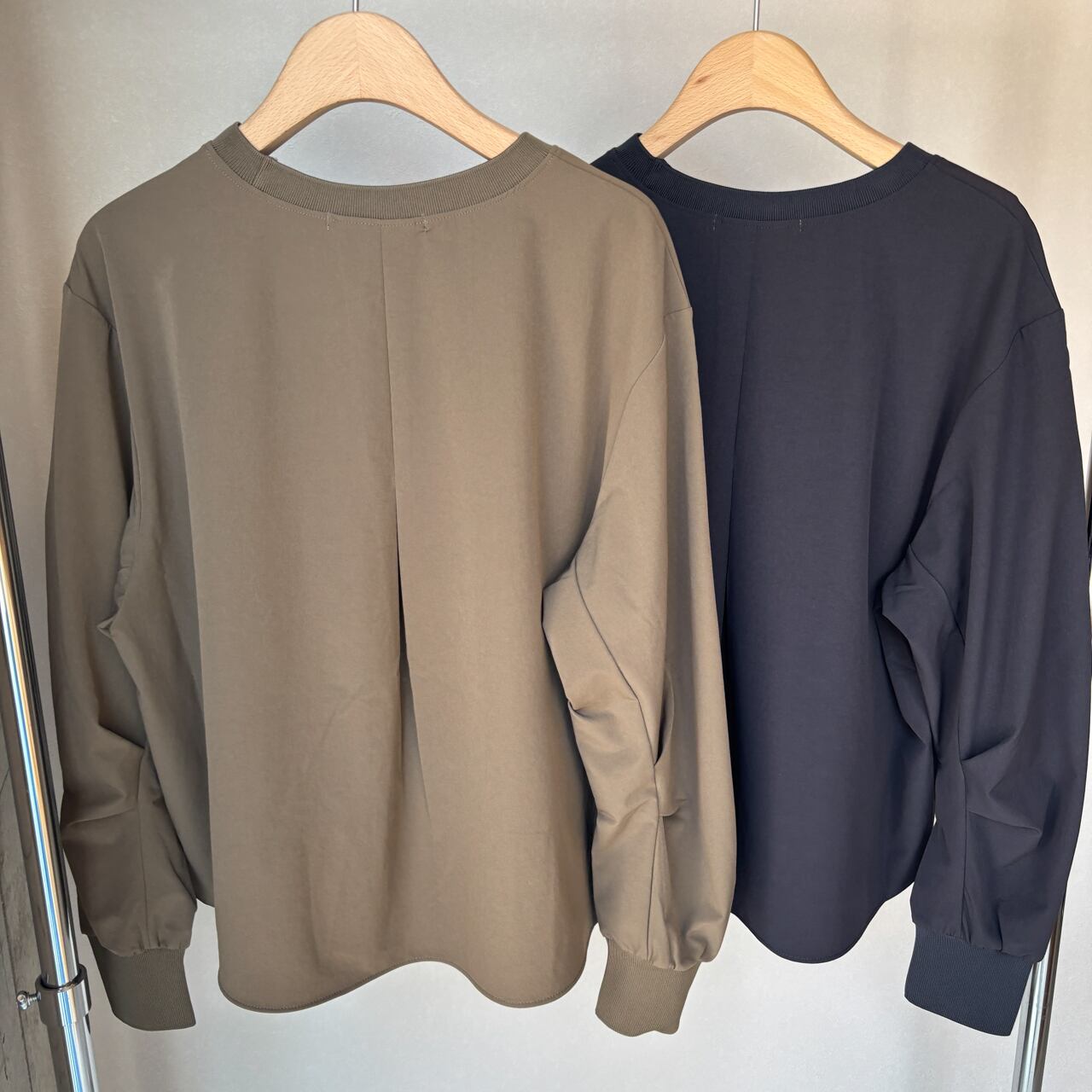 ドロップショルダーとゆったりとしたシルエットが、身体のラインを拾わず、リラックス感とこなれた抜け感を両立してくれます。