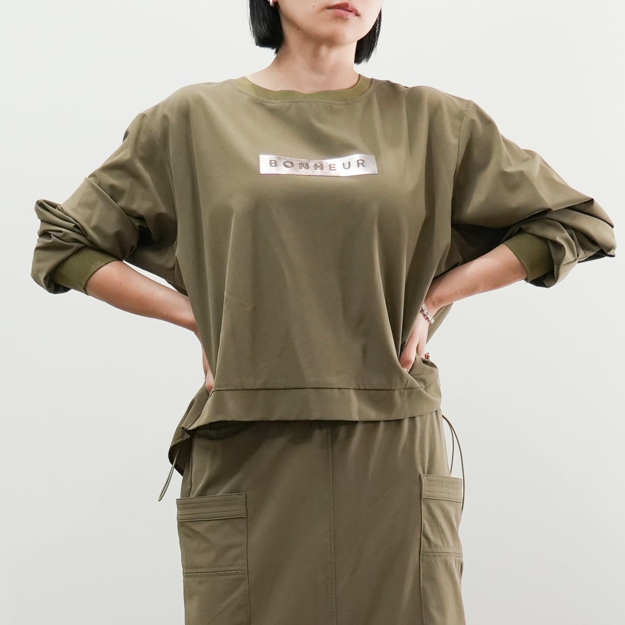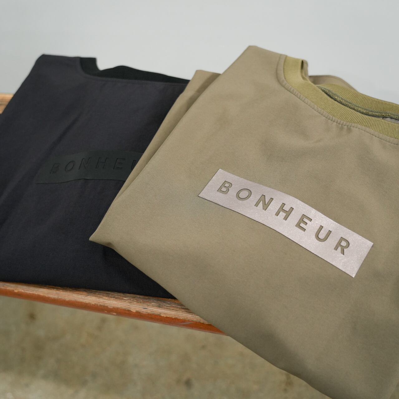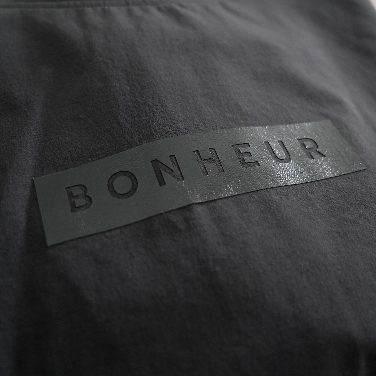 胸元にあしらった合皮パッチの「BONHEUR(=幸せ)」ロゴが、シンプルな中にもさりげない存在感を与えてくれる一着です。