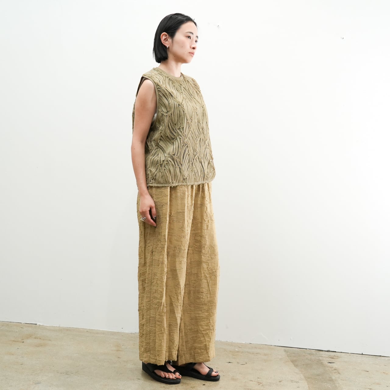 ナチュラルな風合いとレーヨン混の落ち感が合わさり、ゆったりとしたシルエットながらも上品に着こなせます。