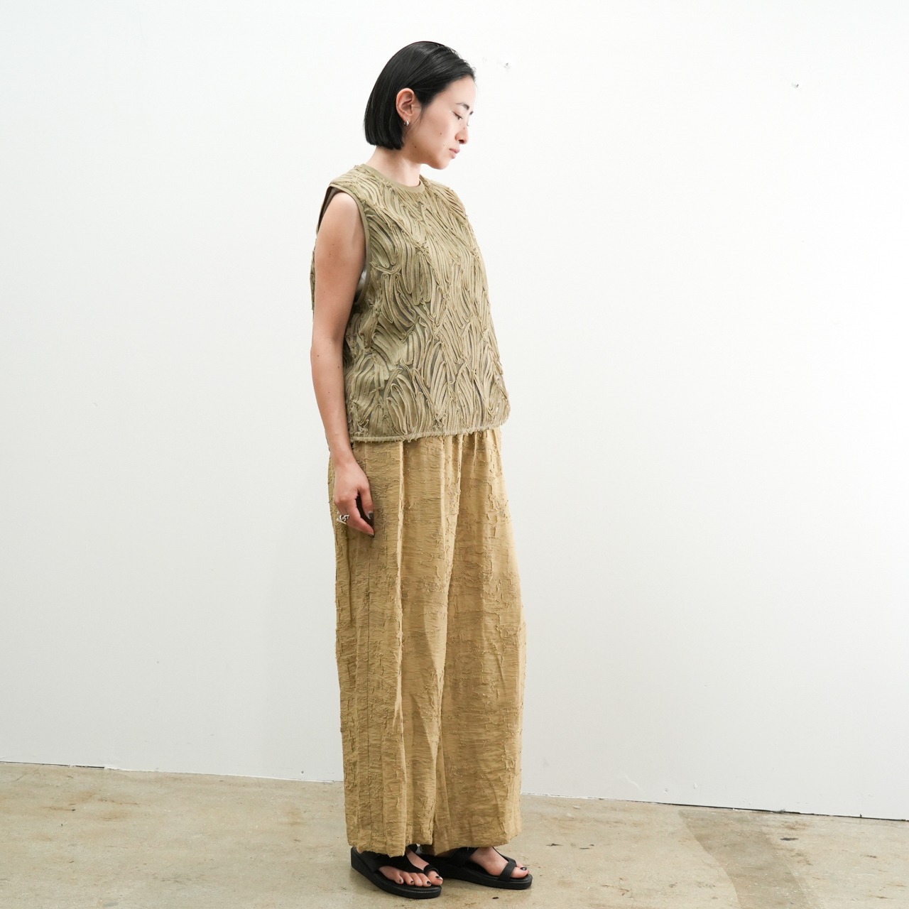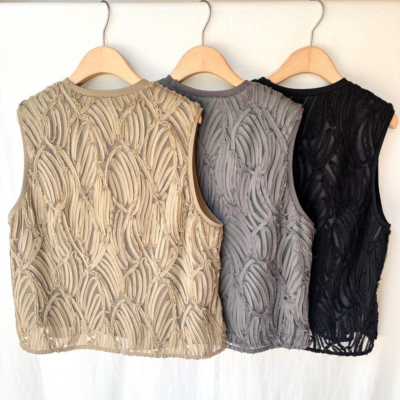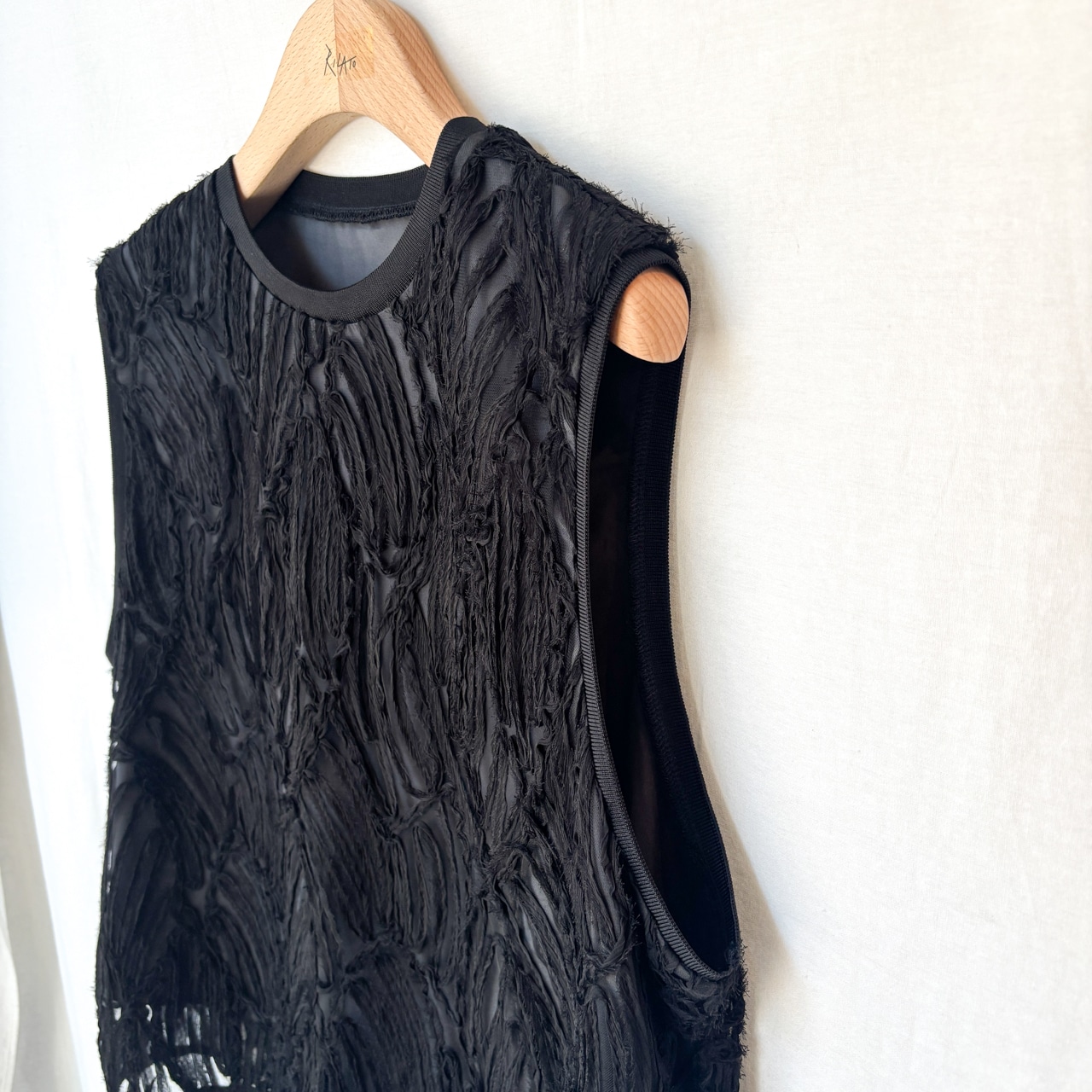 立体感たっぷりの刺繍デザインが目を惹く、存在感のあるノースリーブトップス。