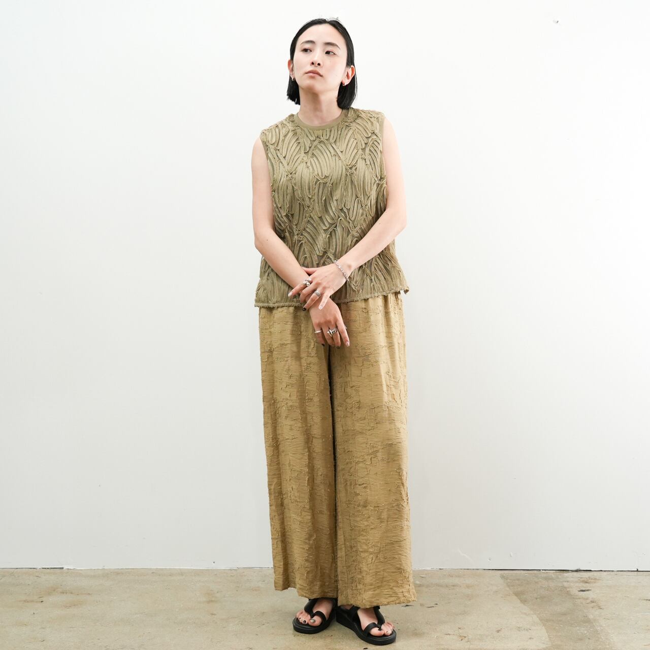 全体にあしらわれたコード刺繍が動きに合わせて揺れ、着るだけでこなれた印象に。