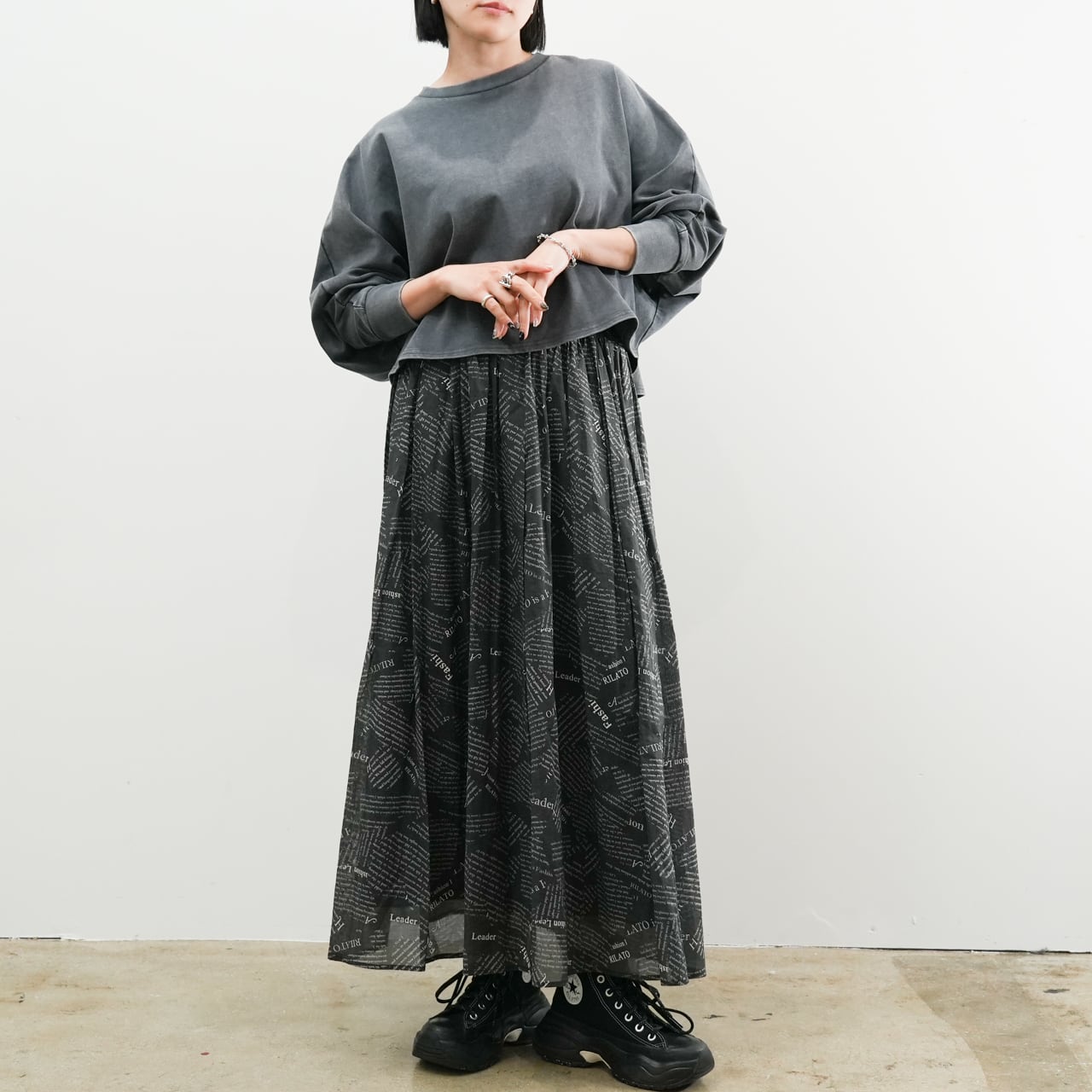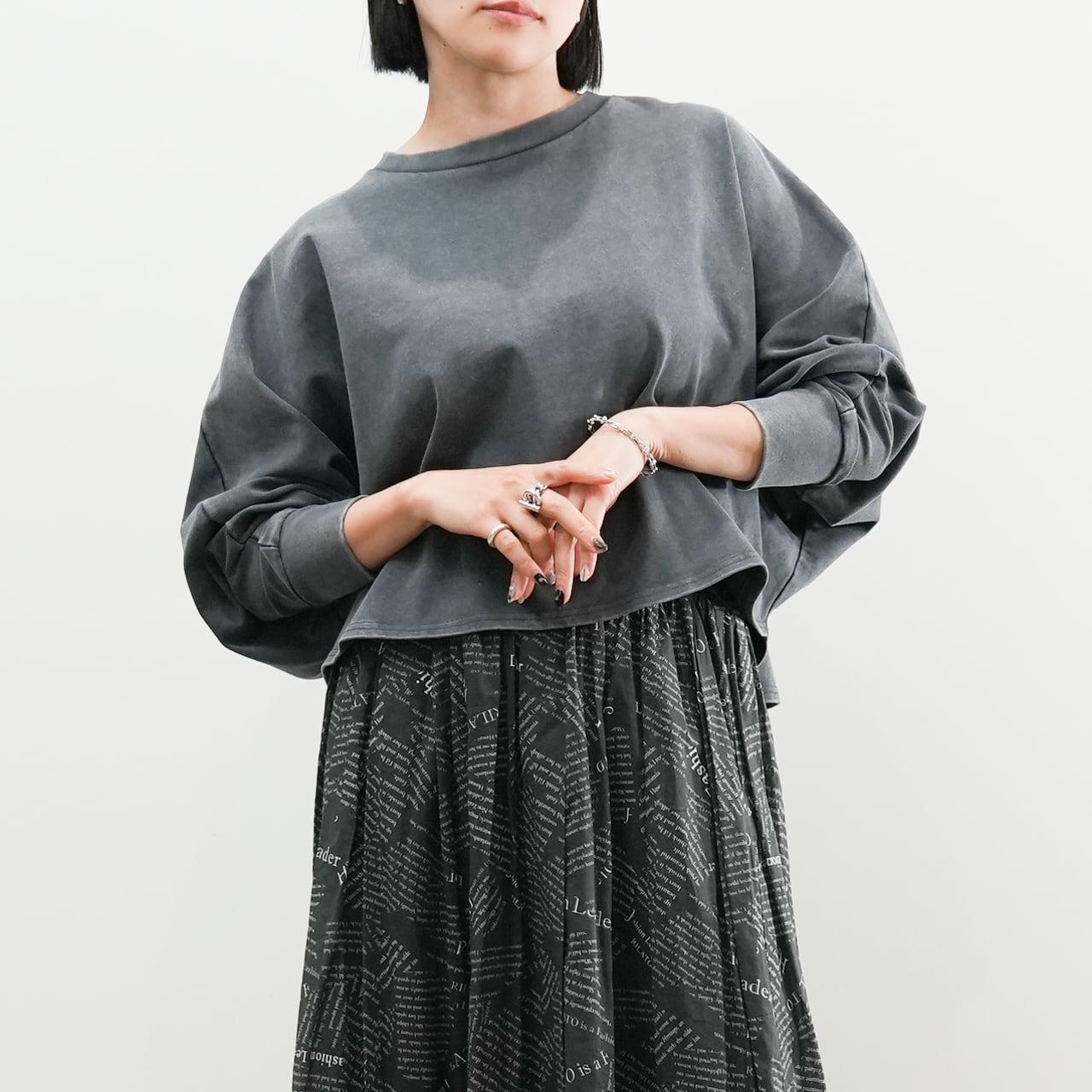 短めのクロップド丈はワイドパンツやロングスカートと好相性で、シンプルに合わせるだけでバランスのとれたコーディネートが完成します。