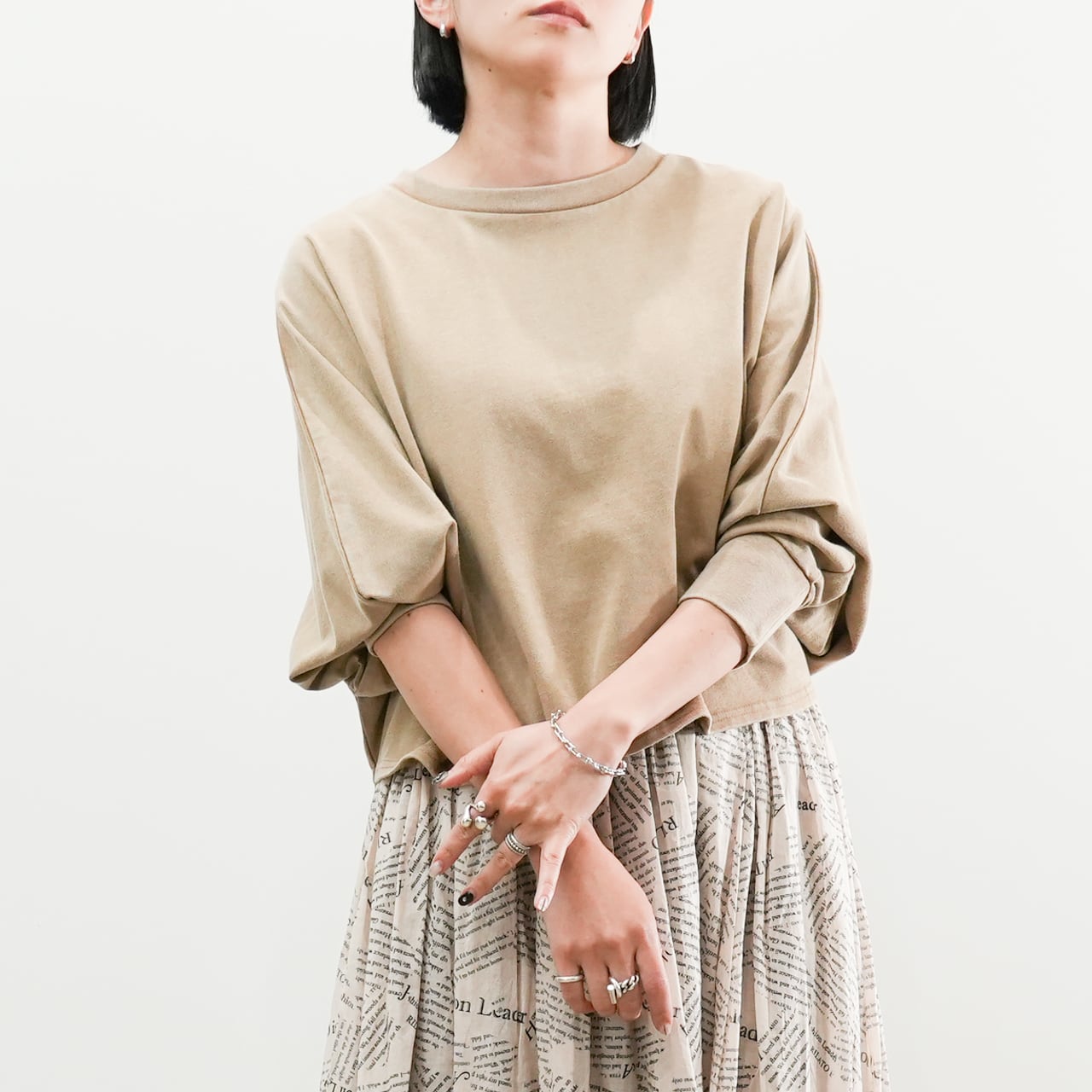 ゆったりとしたドルマンシルエットがリラックス感を演出し、ボリュームのある袖がスタイリングに立体感をプラスします。