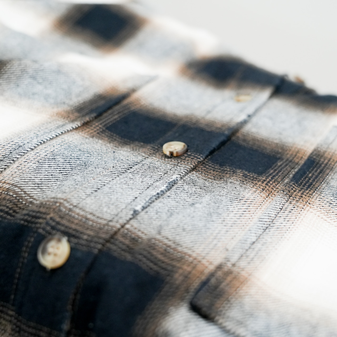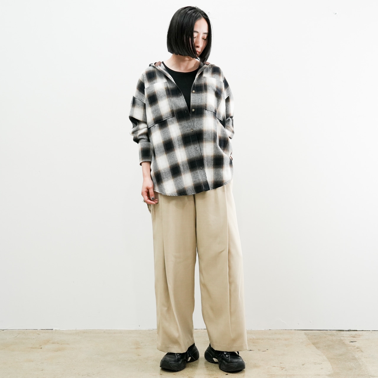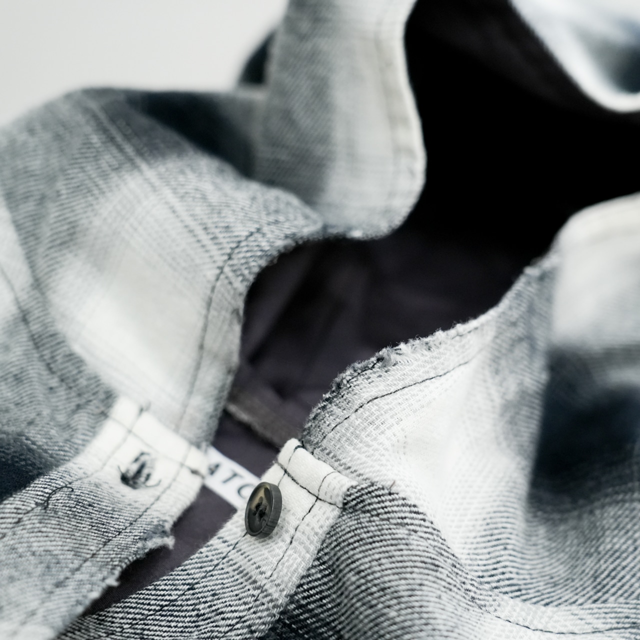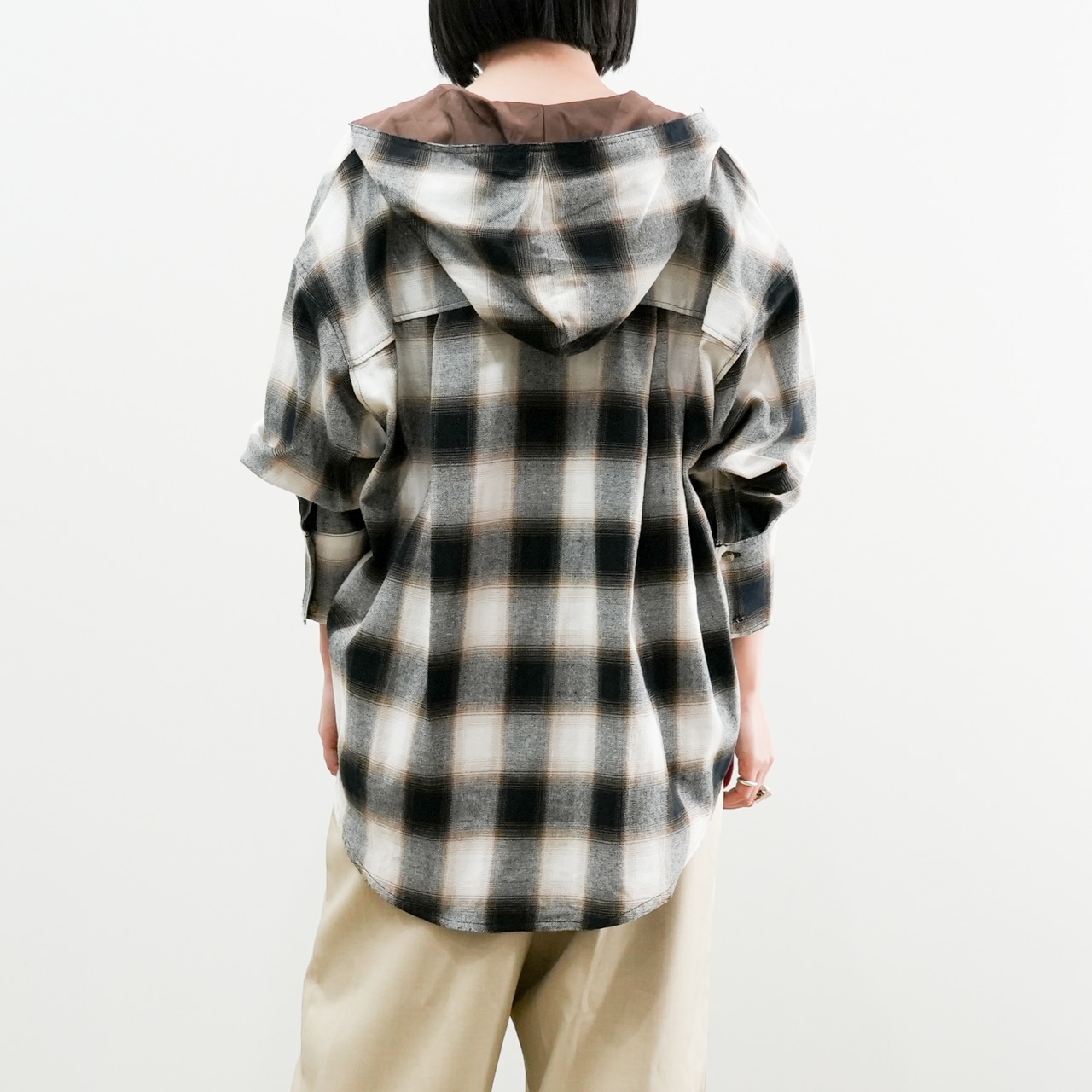 グラデーションのように表現されたオンブレチェックが印象的なフード付きシャツ。