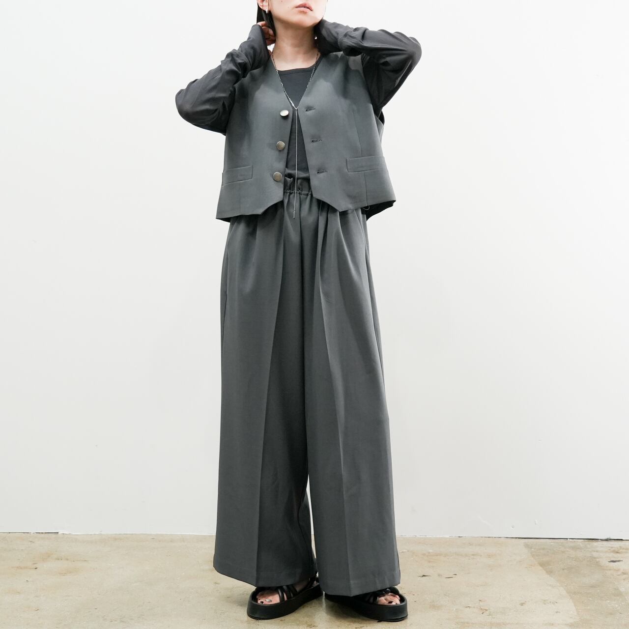 軽やかなポリエステル素材で扱いやすく、季節を問わずスタイリングに取り入れやすい一枚です。