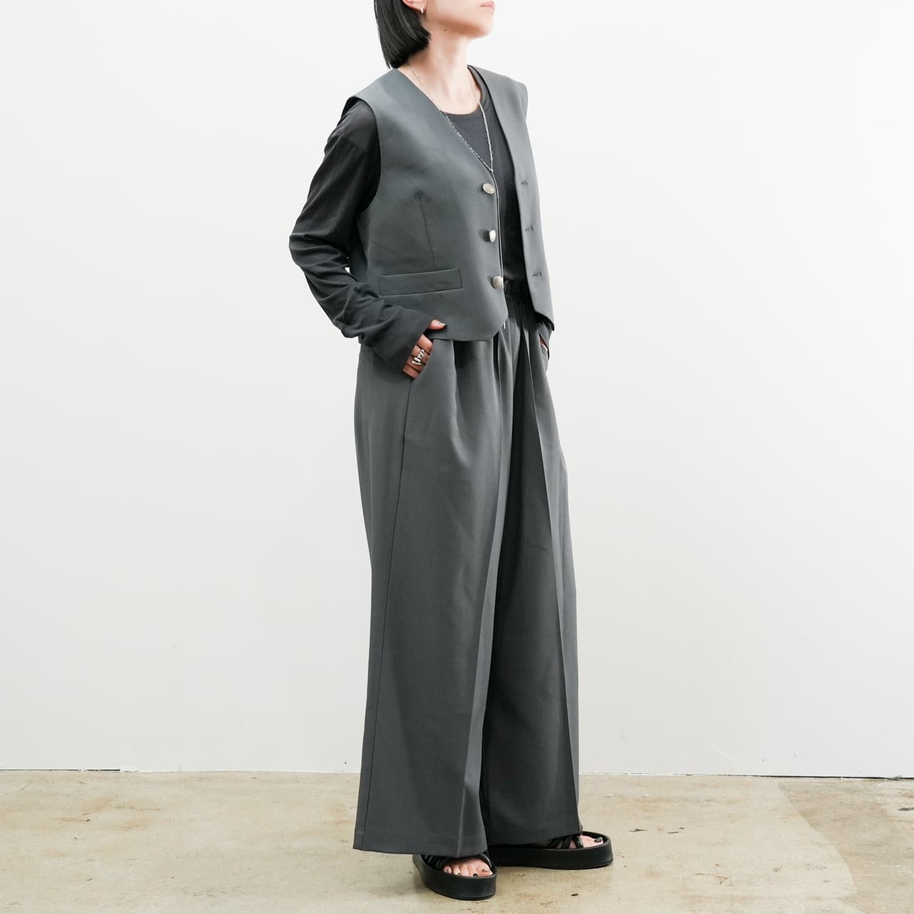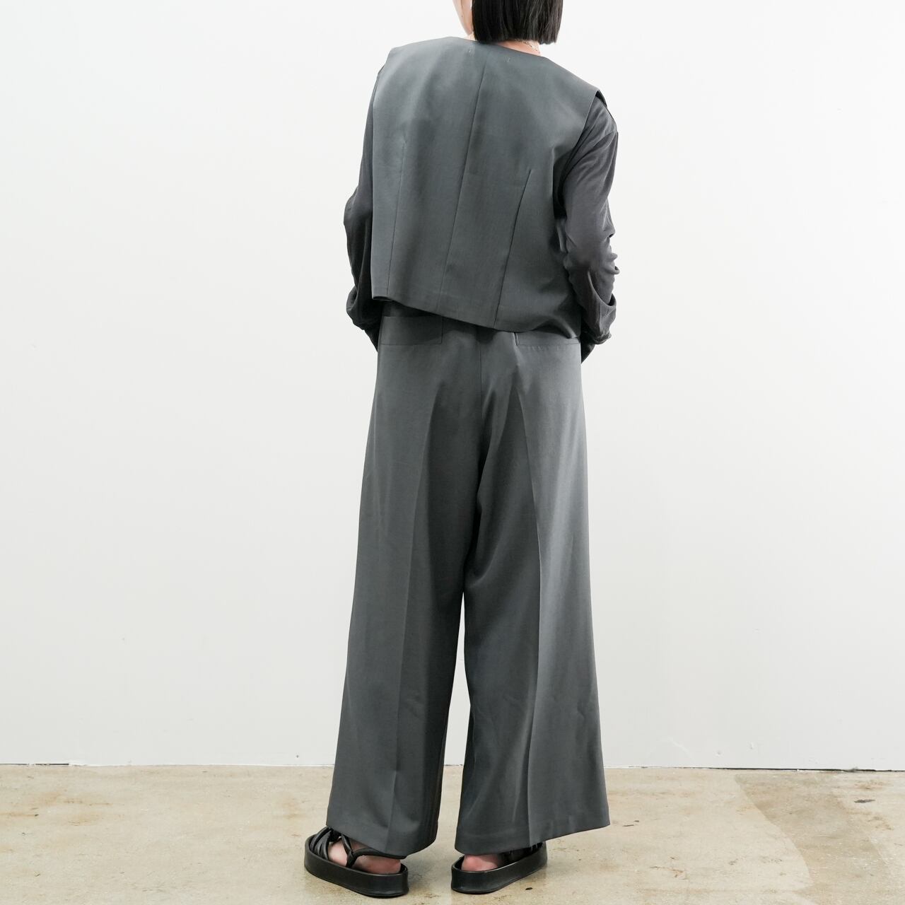 同素材のパンツとセットアップで着用すれば、より洗練された大人のコーディネートに。