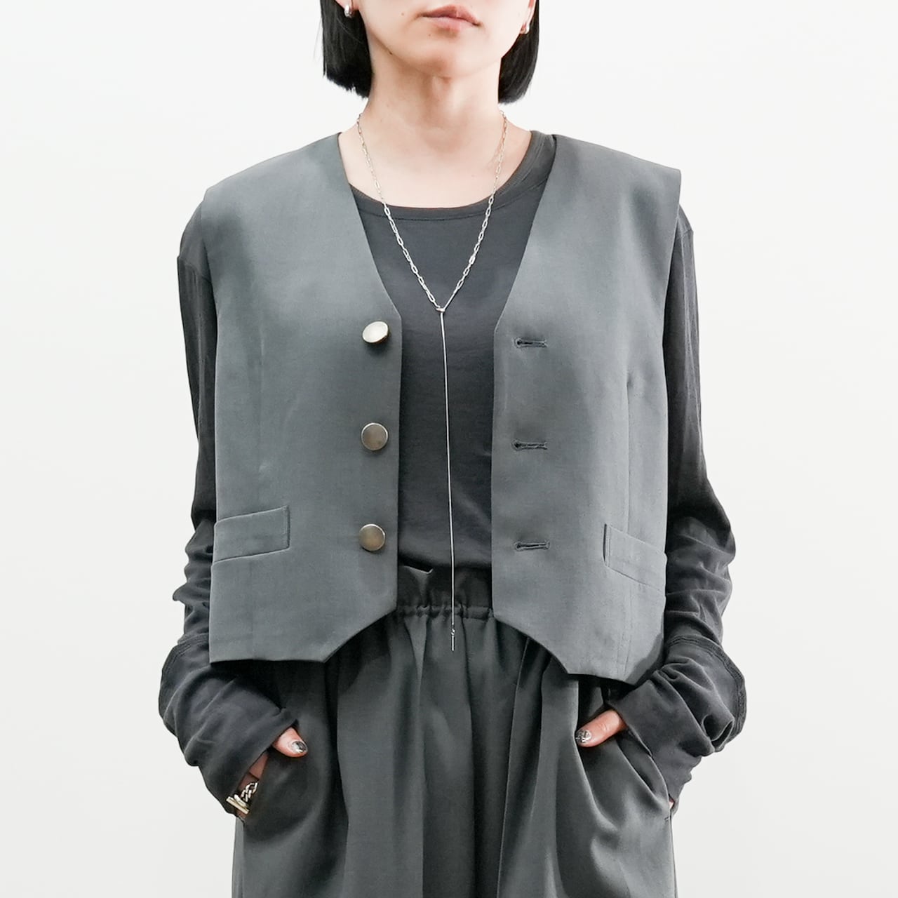 シンプルなカットソーやシャツに重ねるだけで、こなれたレイヤードスタイルが完成します。