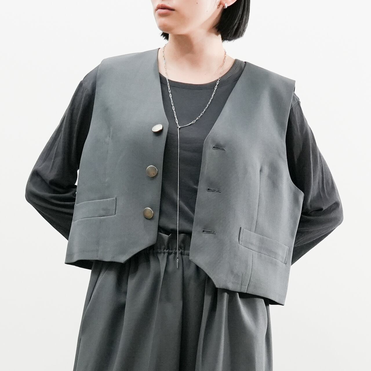 やや短めの着丈でバランスが取りやすく、ワイドパンツやロングスカートとの相性も抜群。