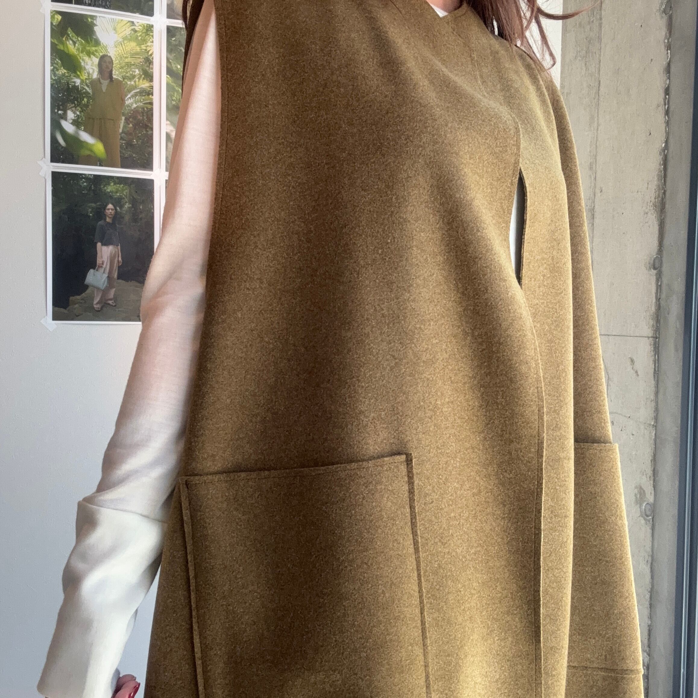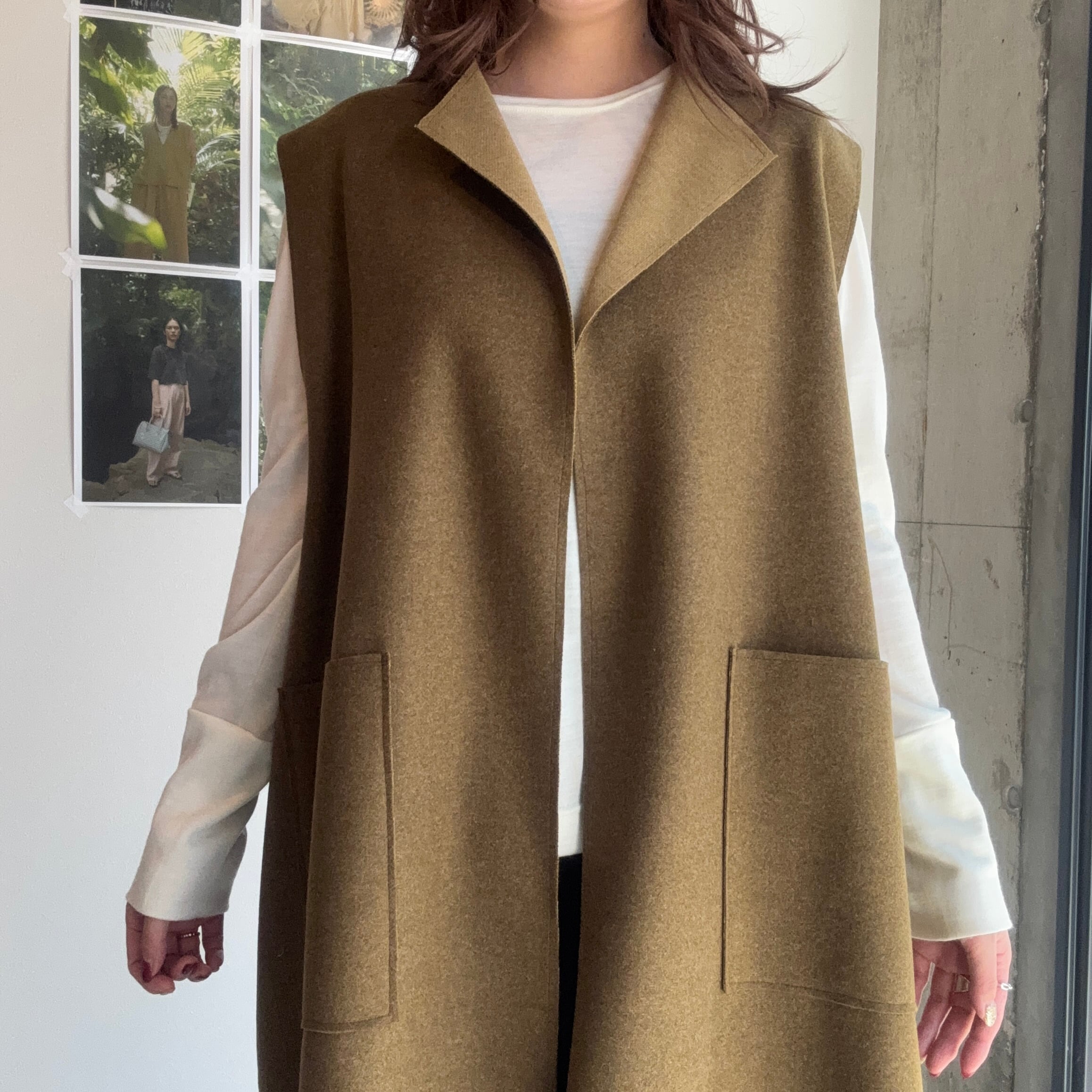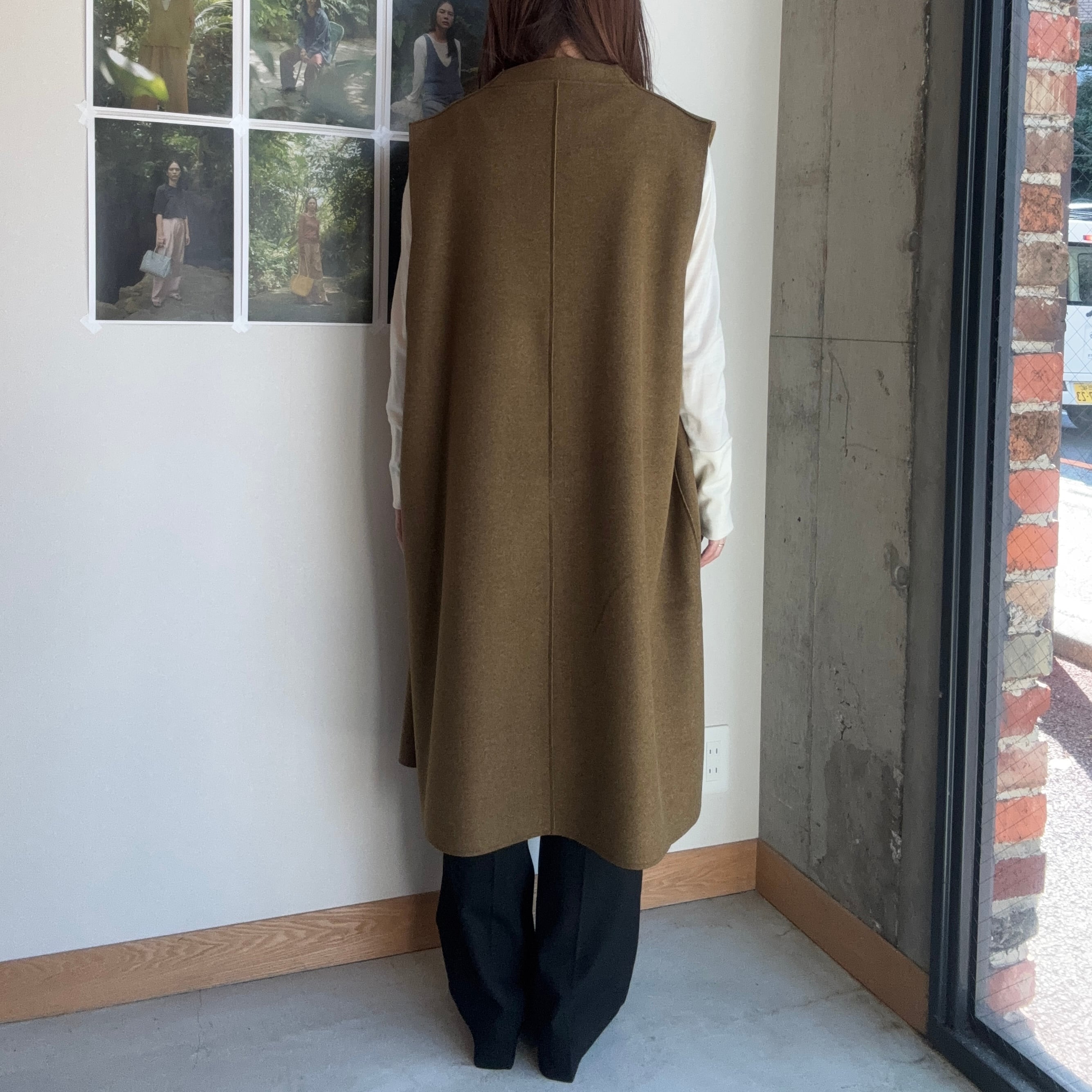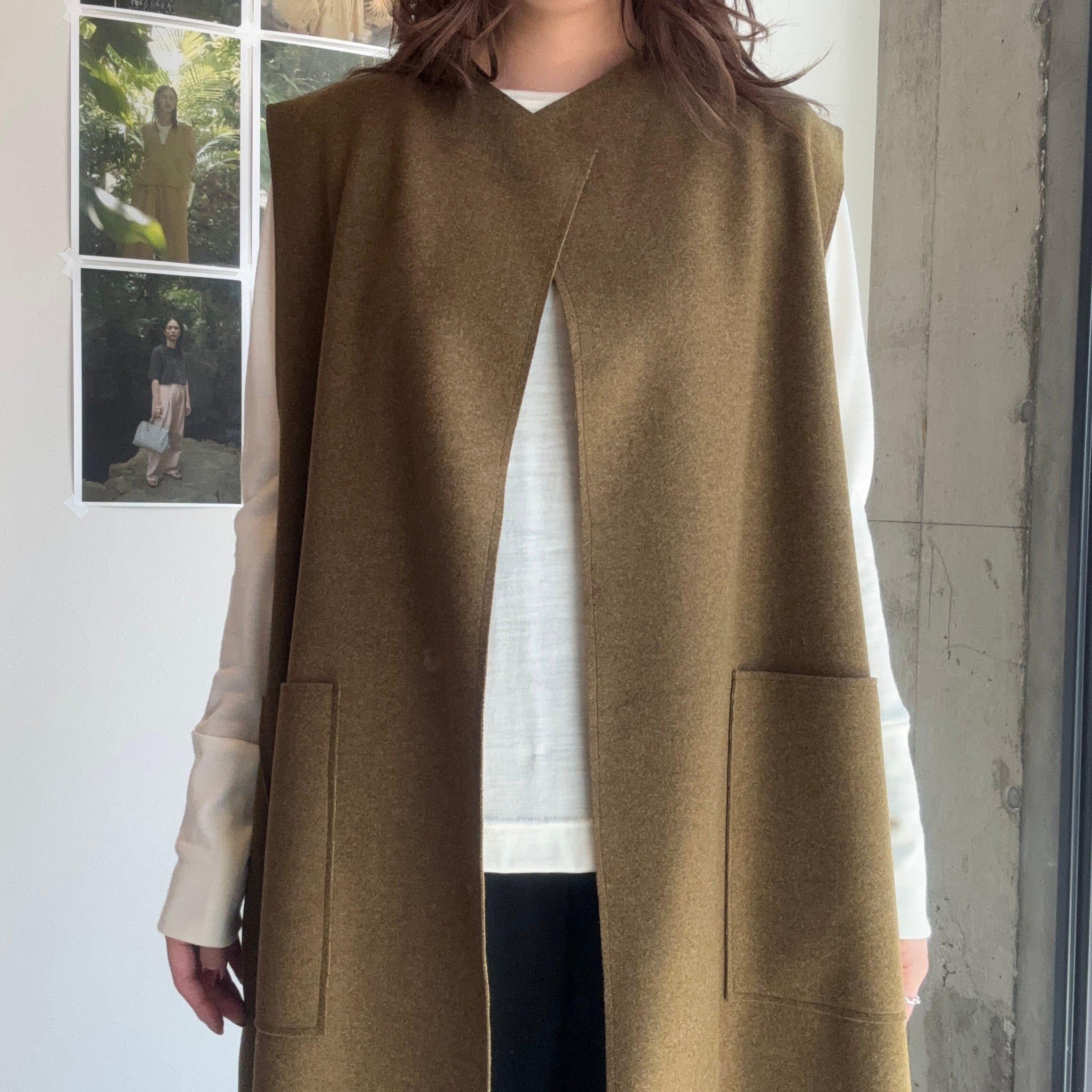 上品な質感とシルエットで魅せる、フェイクウール素材のロングベスト。