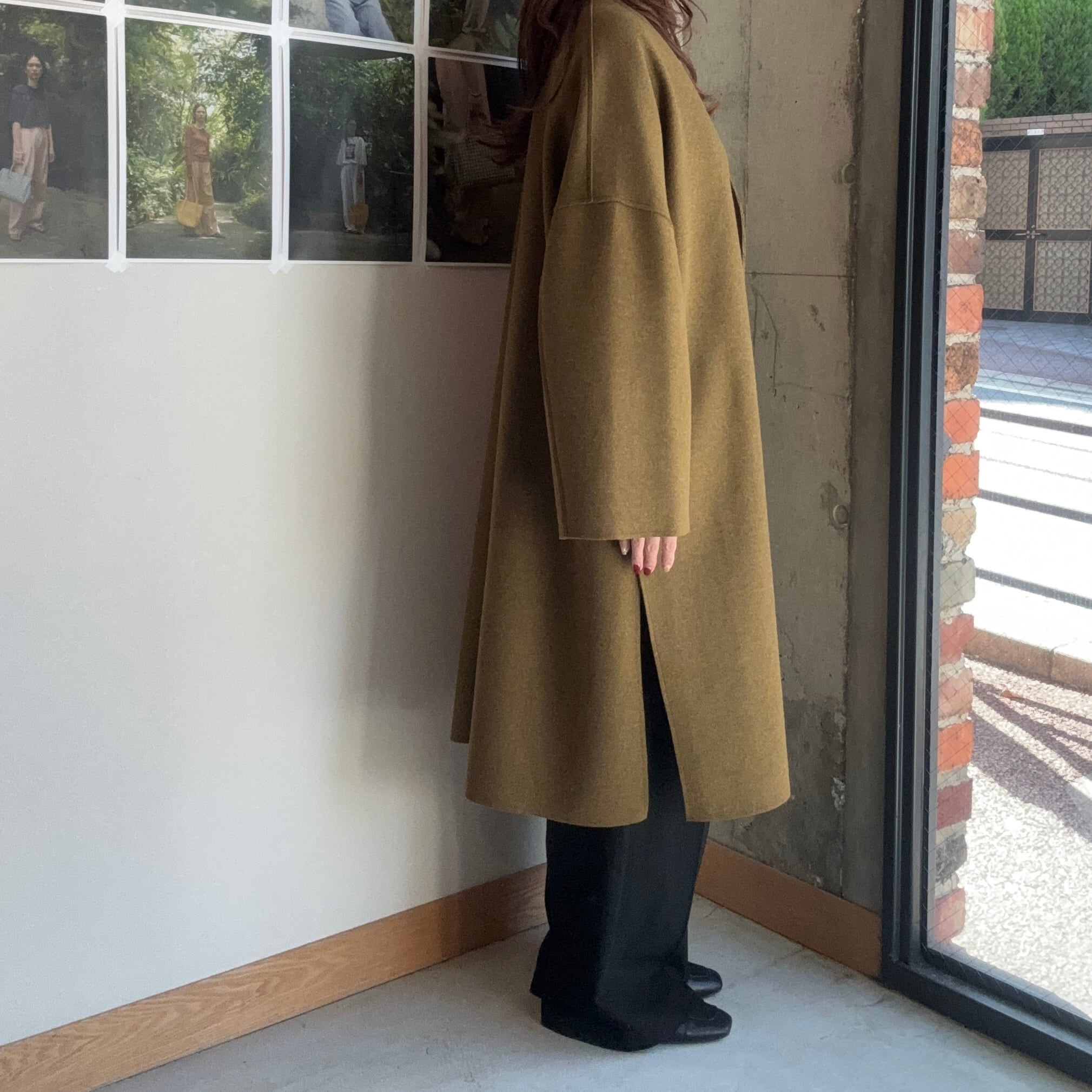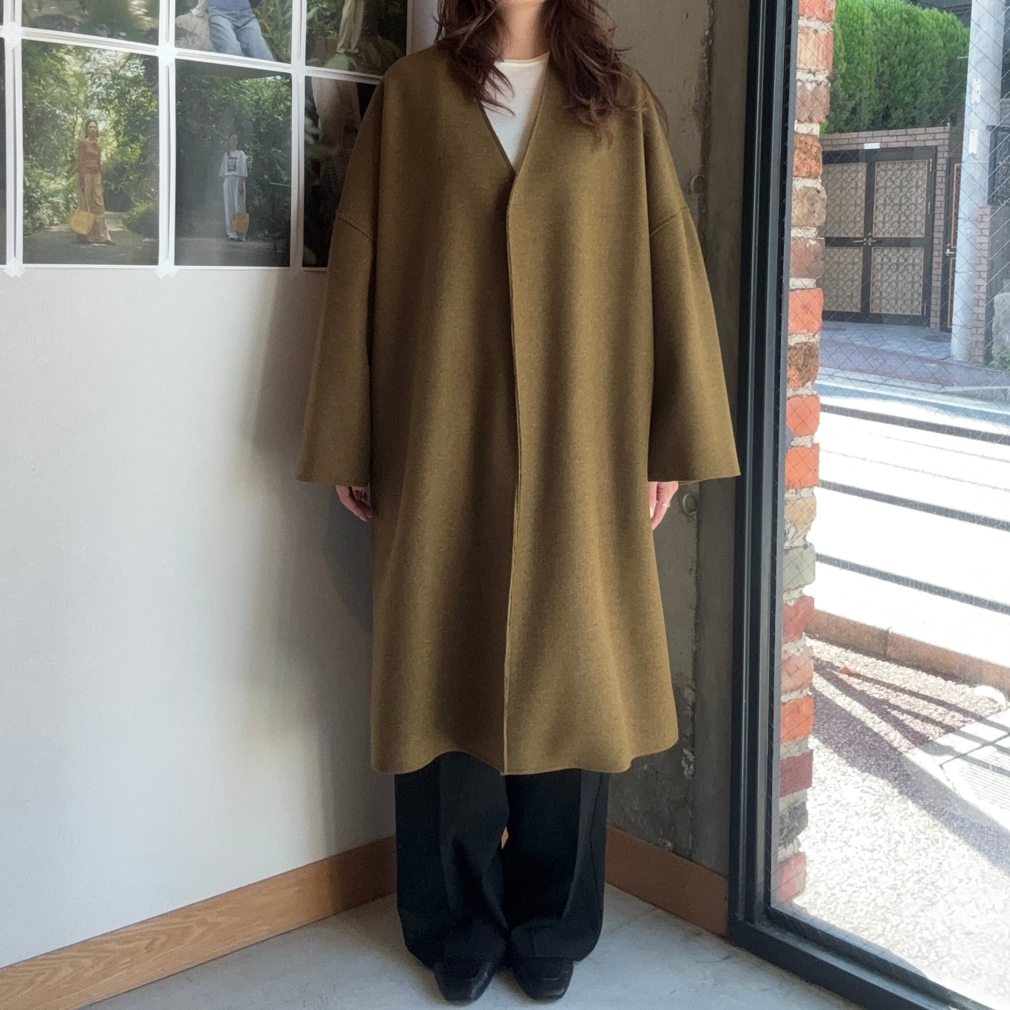 やわらかな風合いと軽やかな着心地が魅力のフェイクウールノーカラーコート。