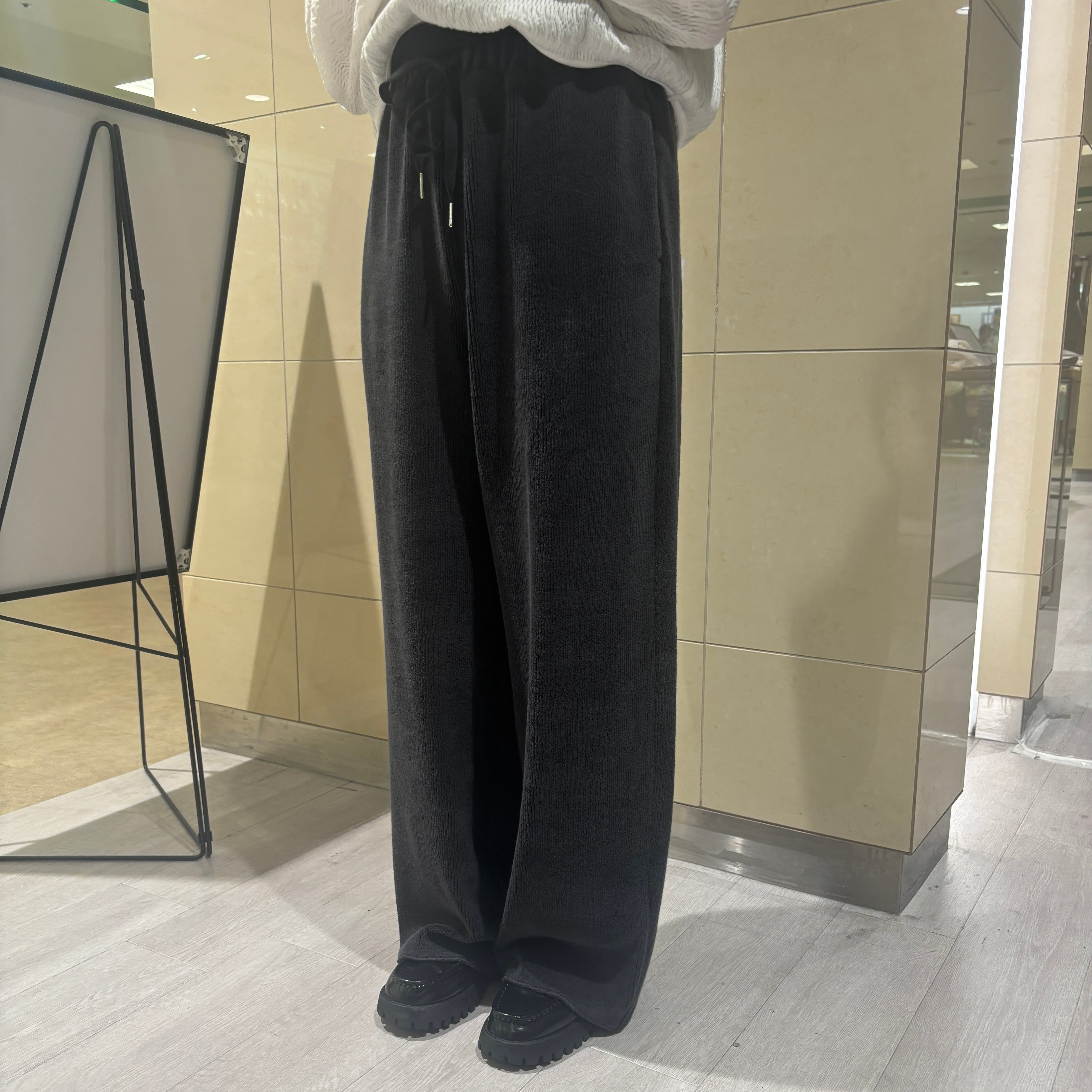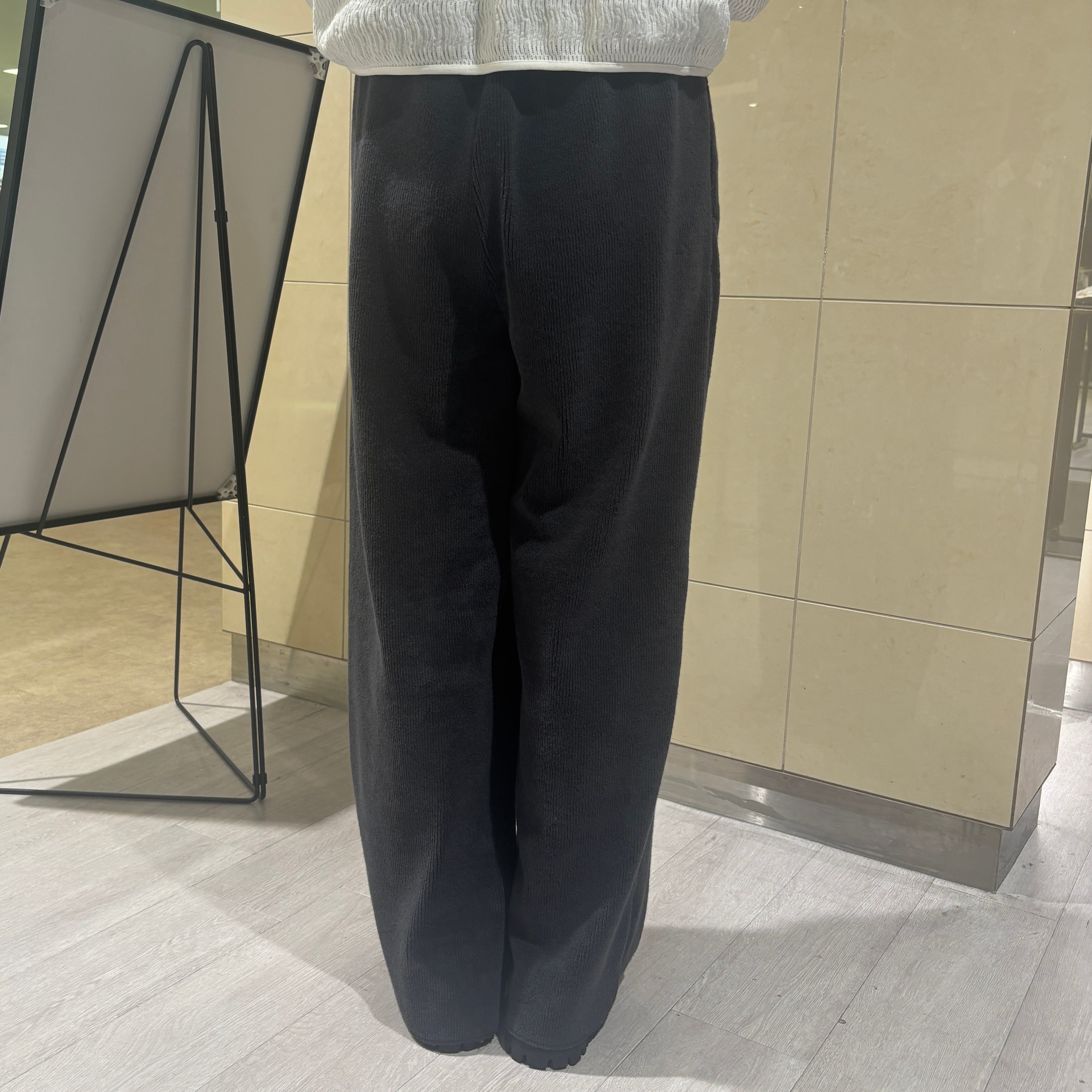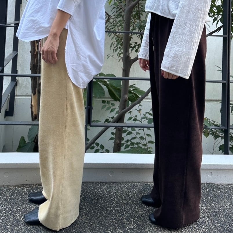 ふんわりとした肌触りと、しなやかな伸縮性が魅力の〈トリコットパイル素材〉を使用したパンツ。