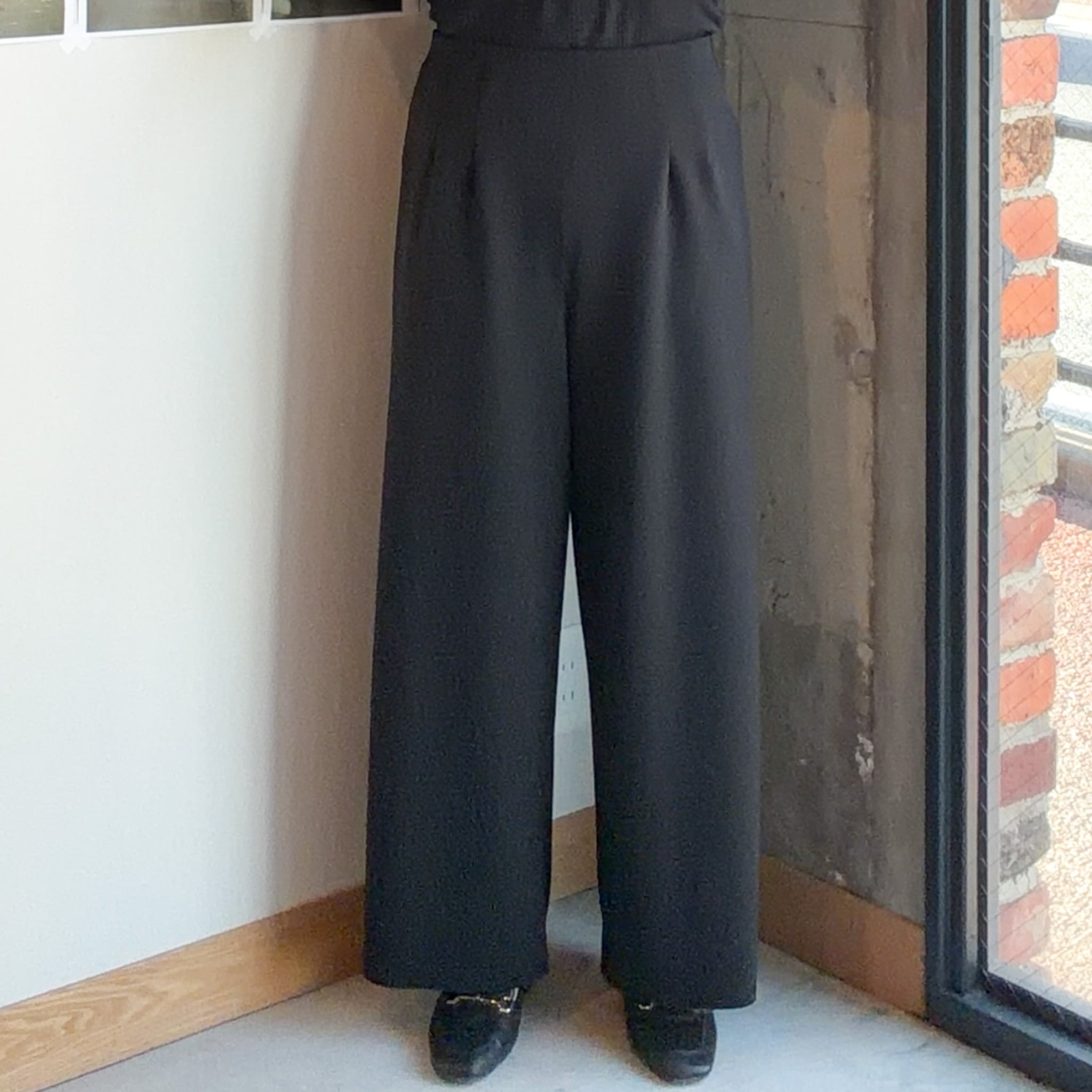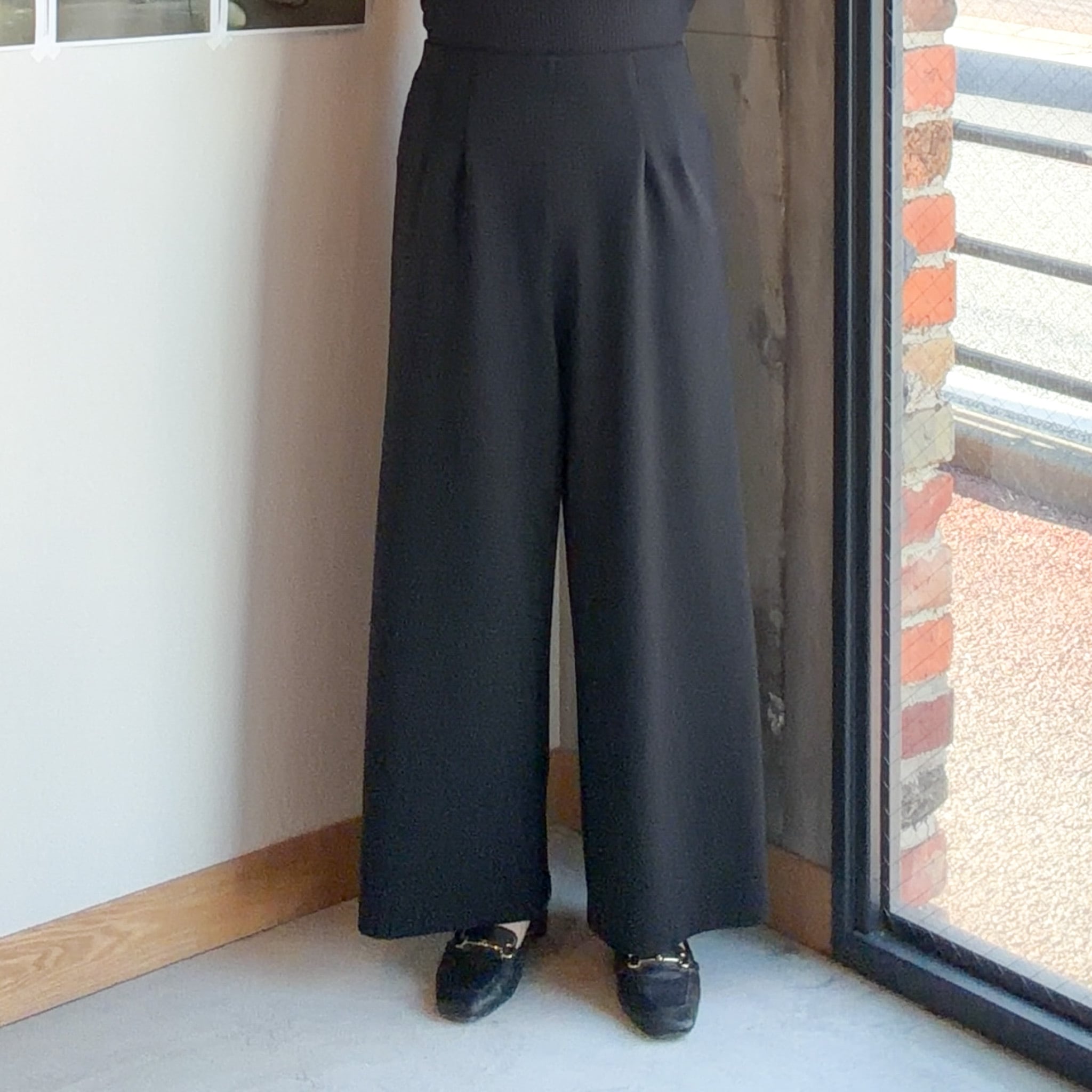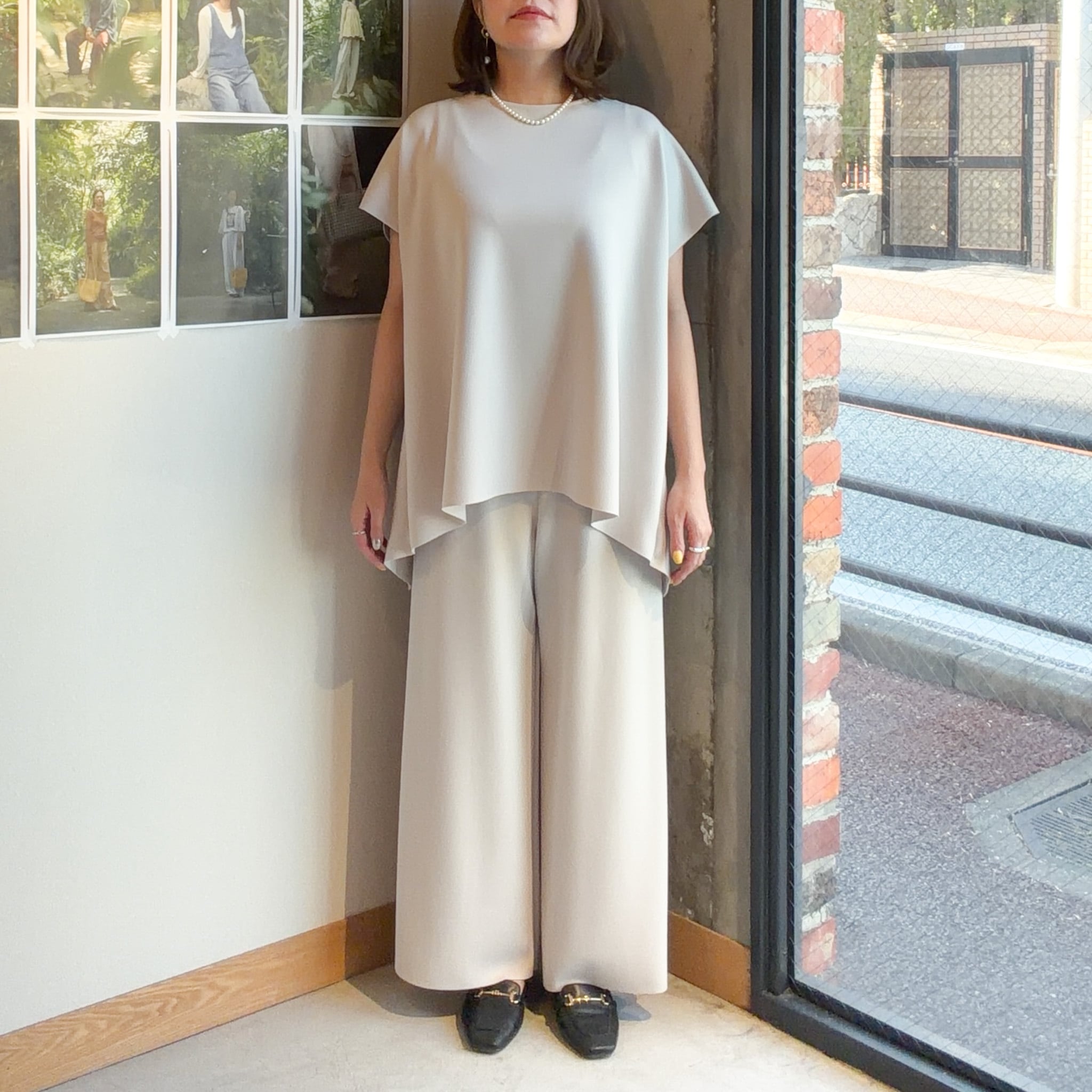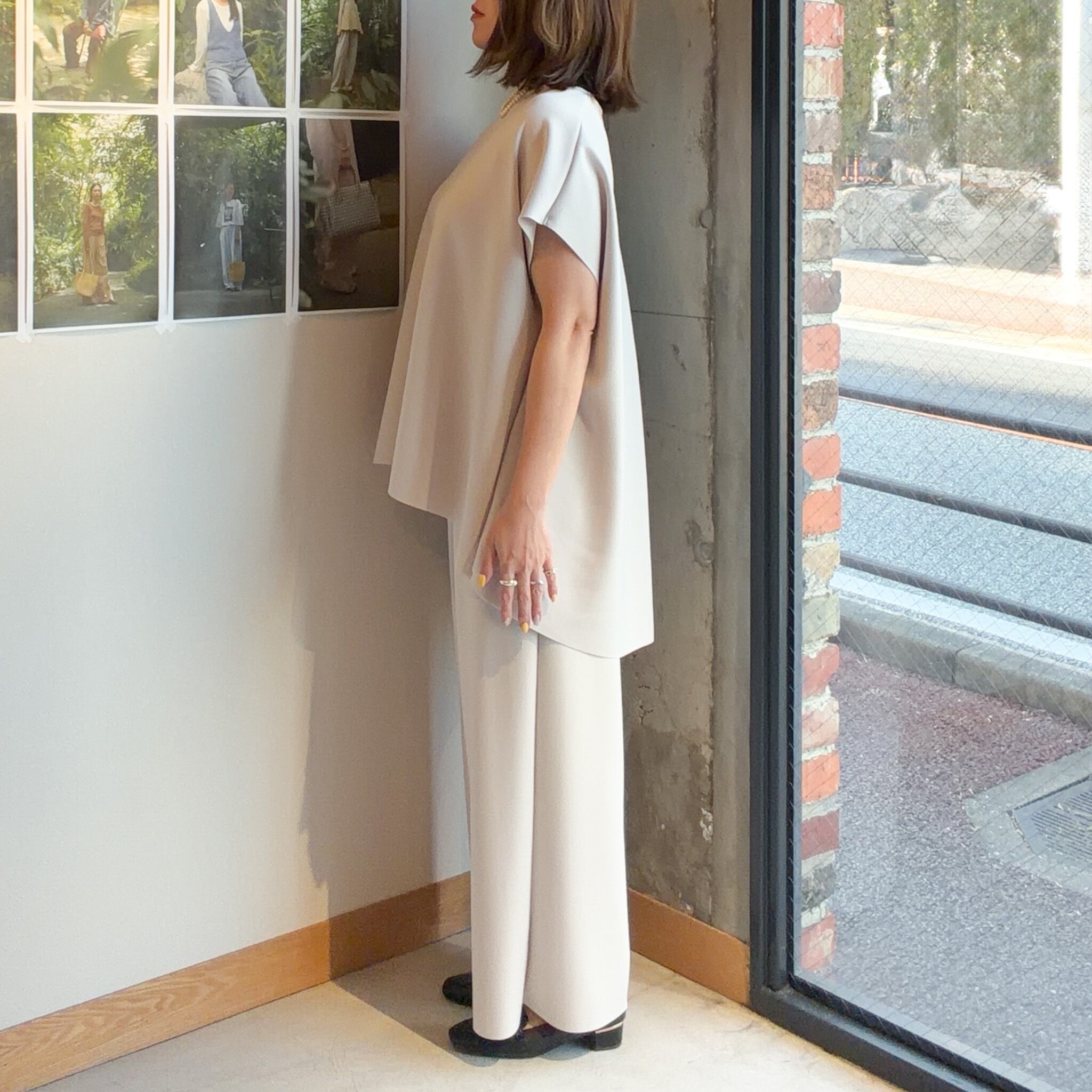 程よくゆとりを持たせたラインが脚のラインを拾いにくく、自然に体型をカバーしながら、すっきりとした印象に仕上げています。