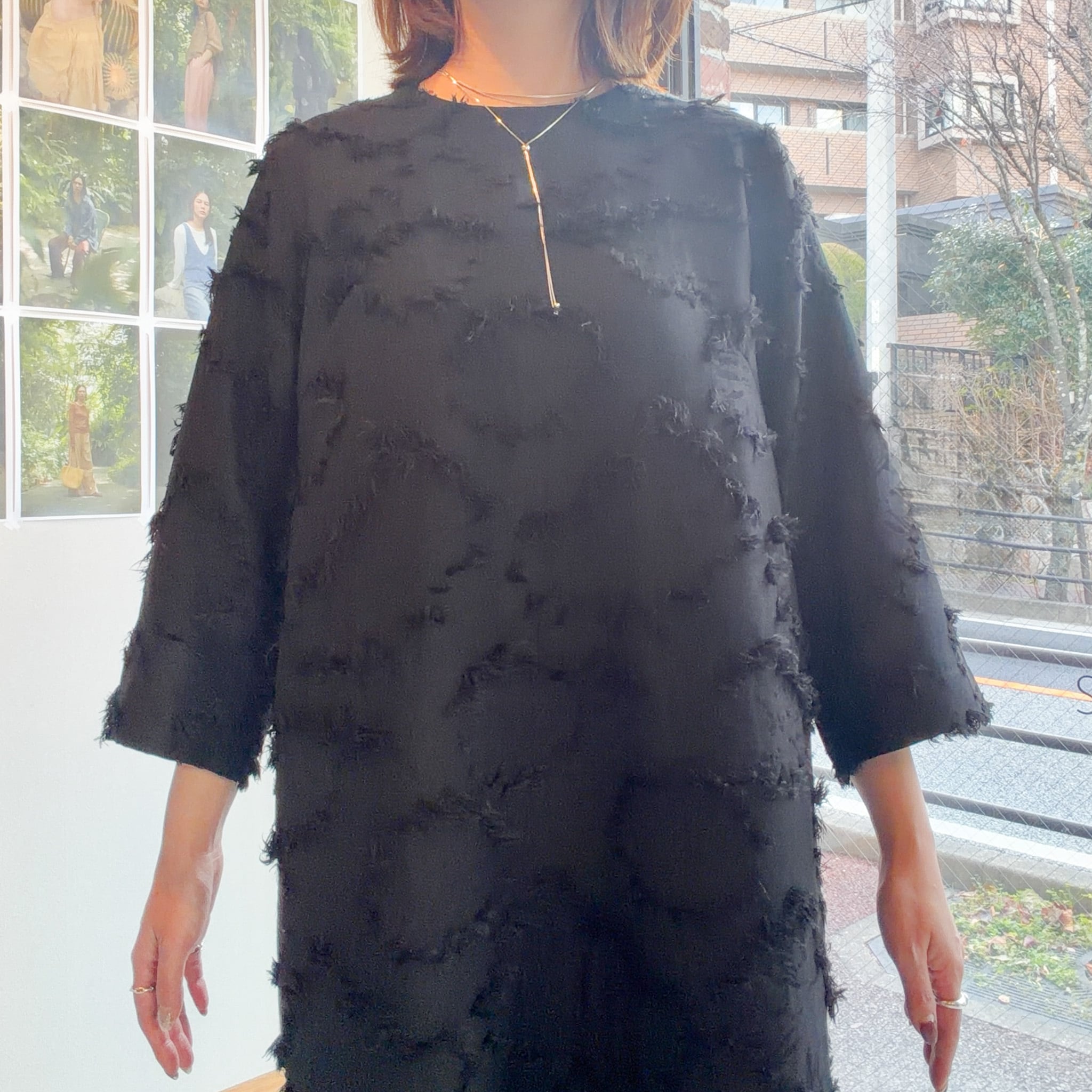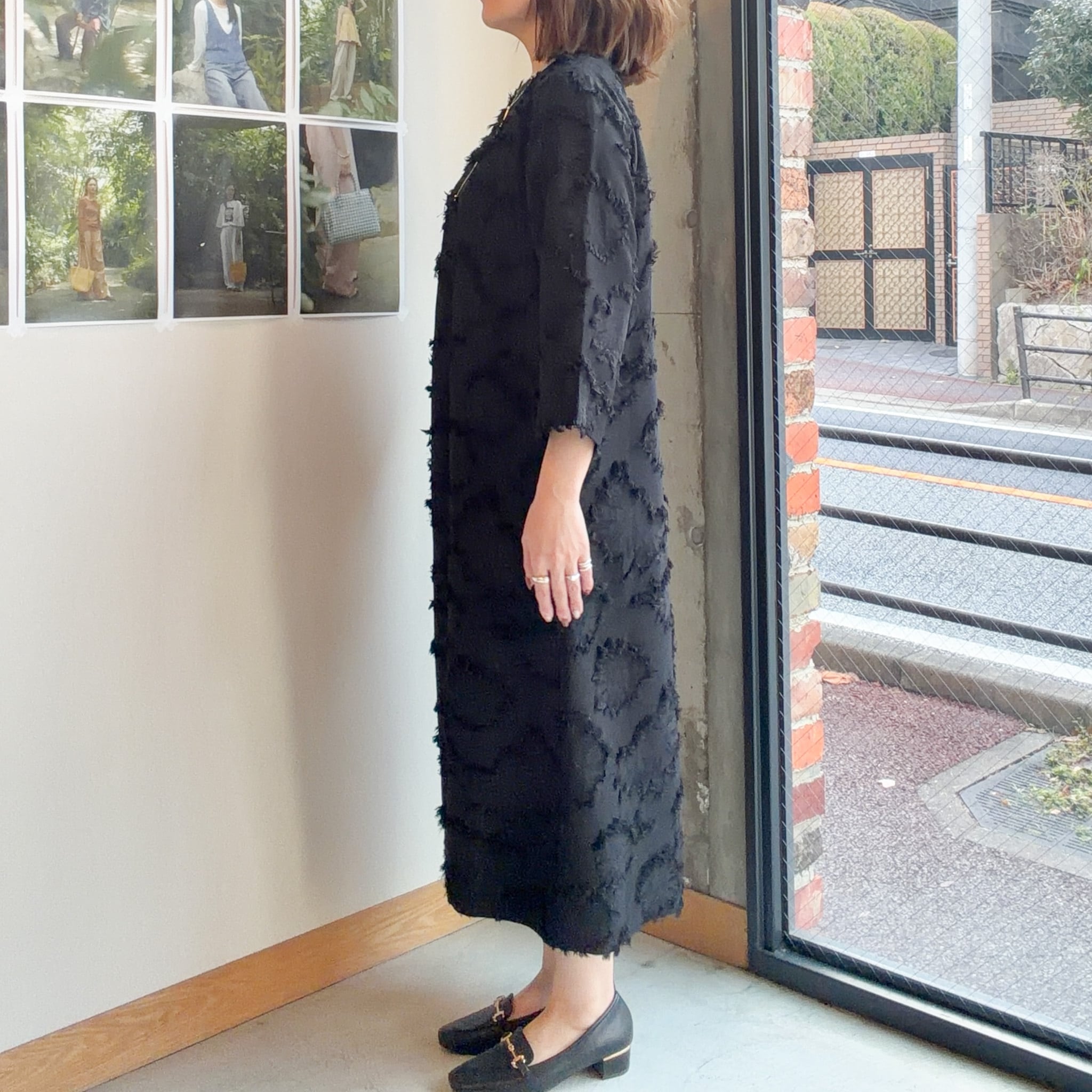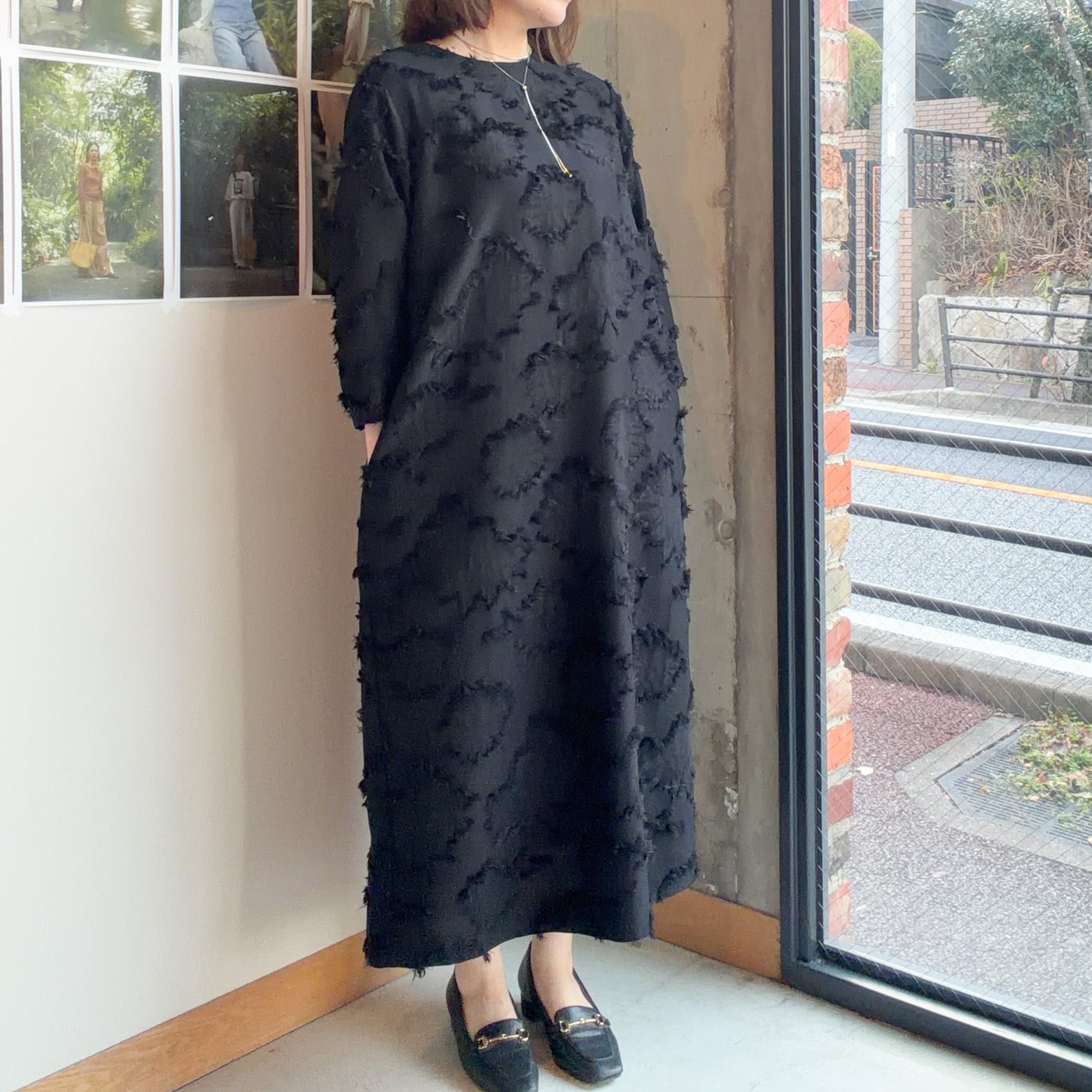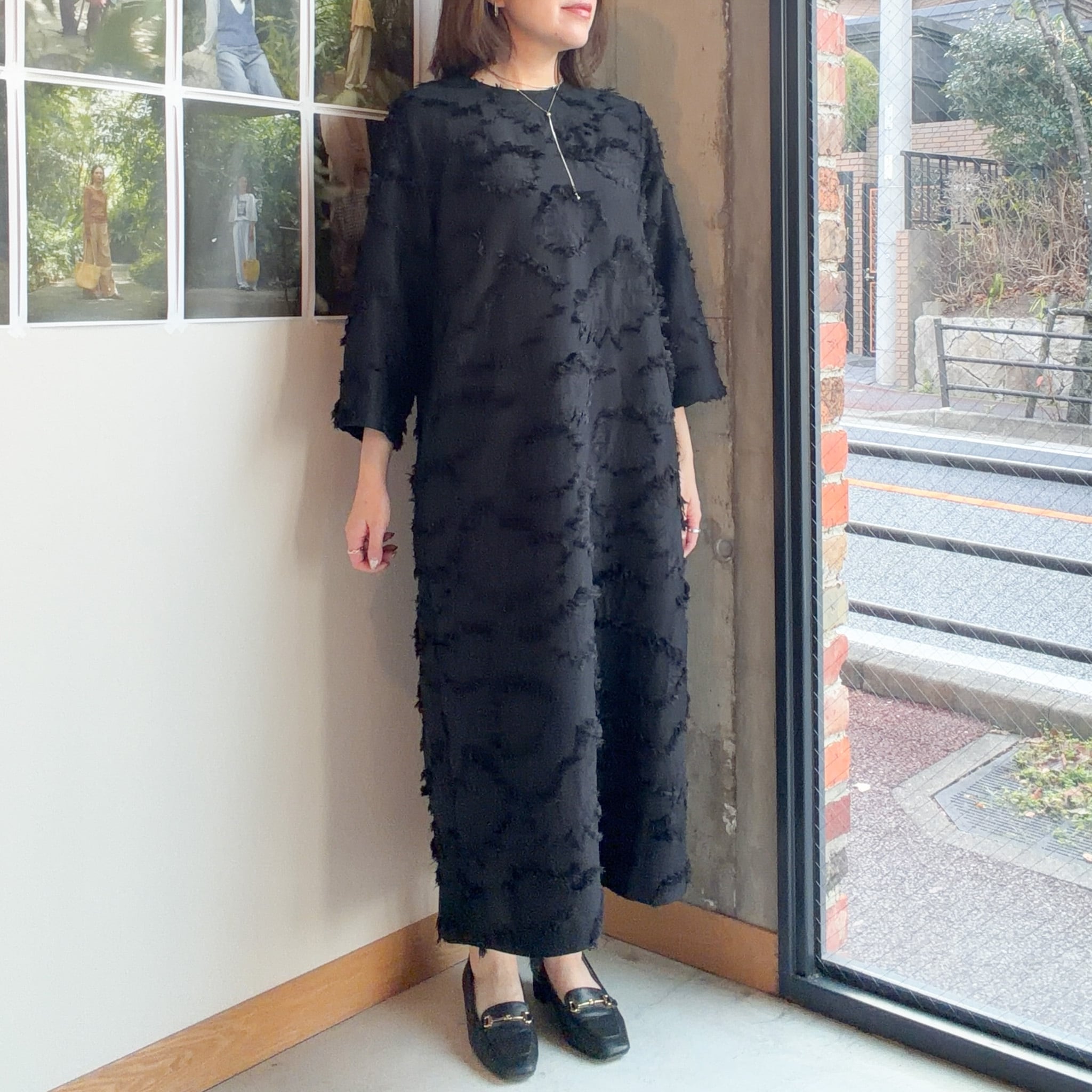 立体感のあるジャガード素材が、シンプルなシルエットの中にさりげない華やかさを添えてくれます。