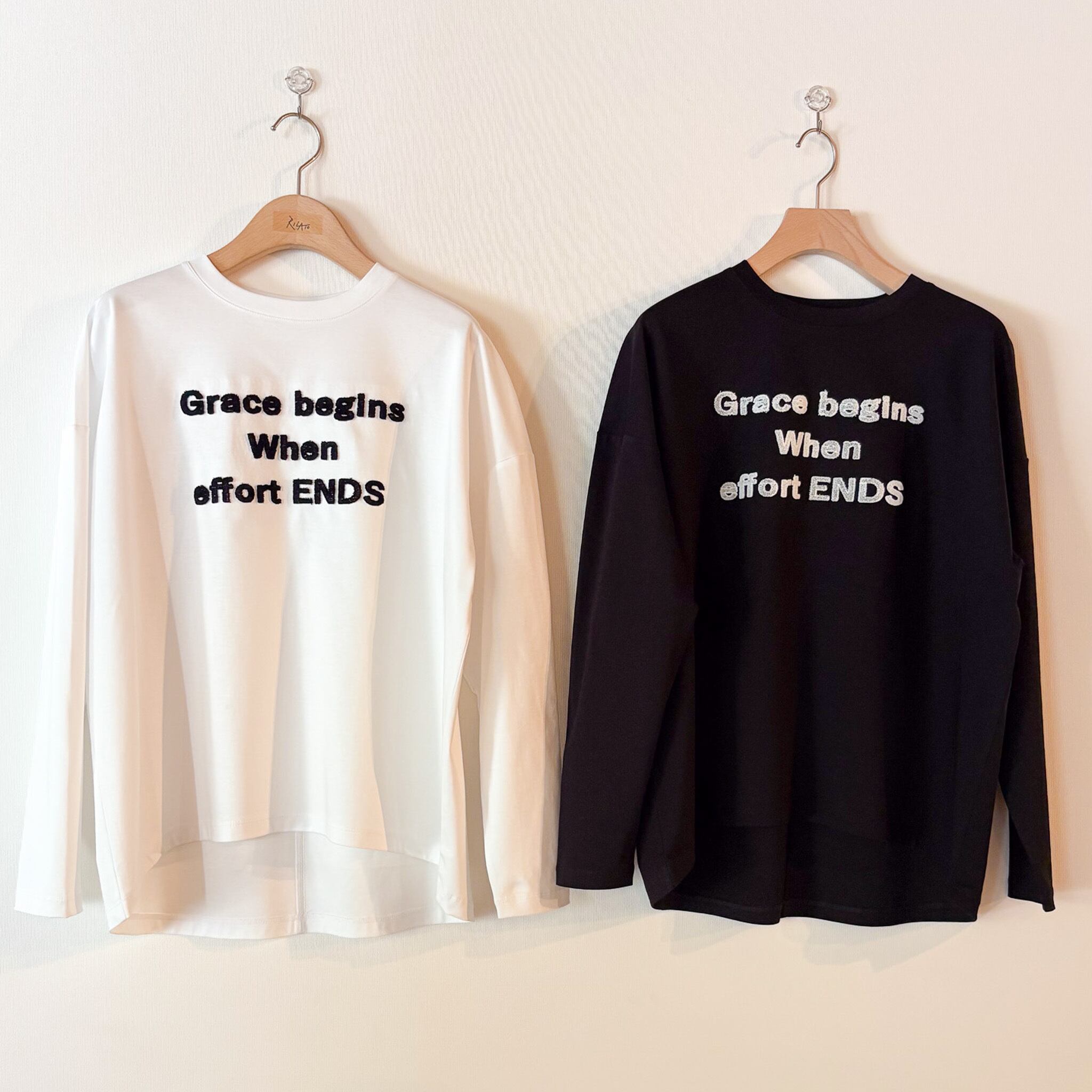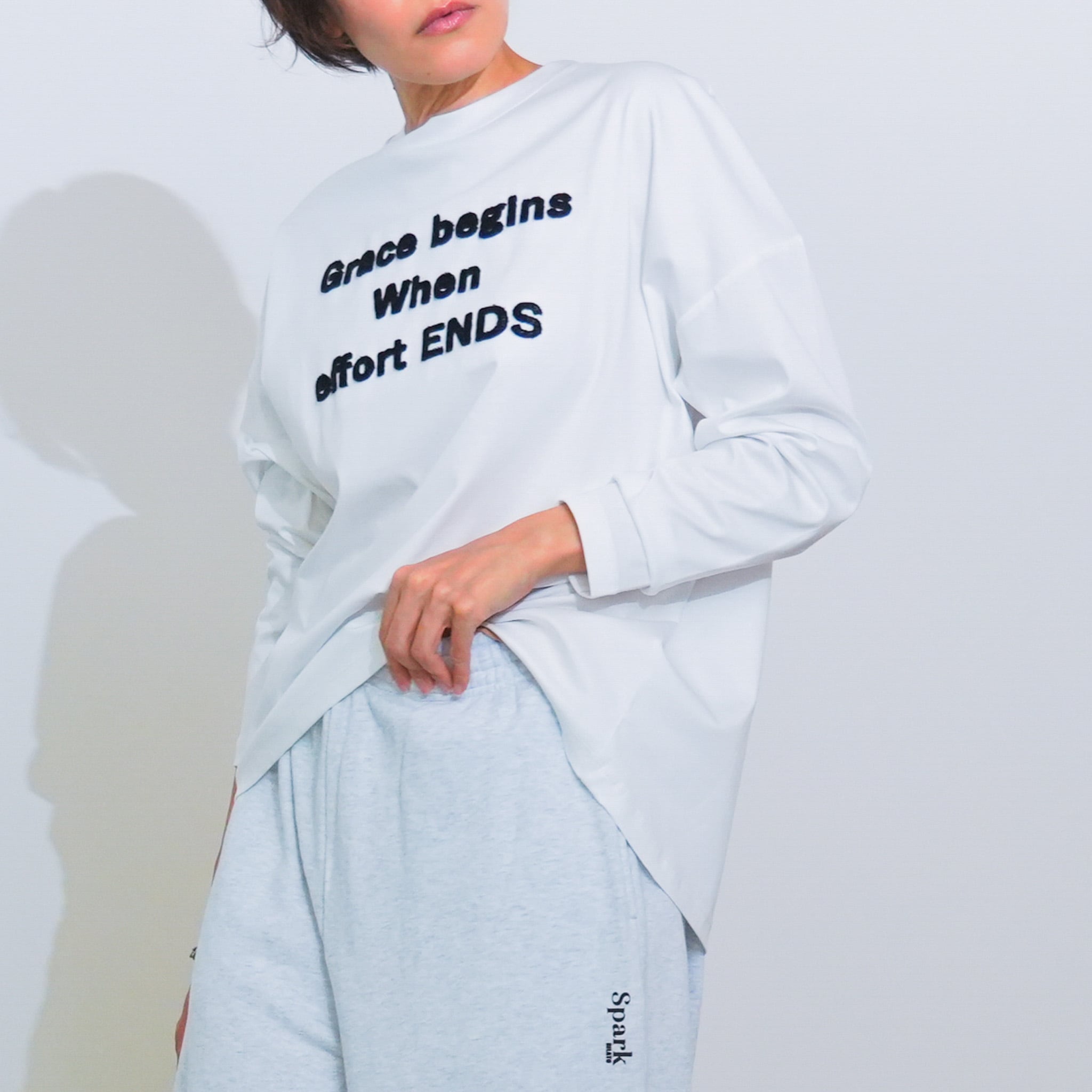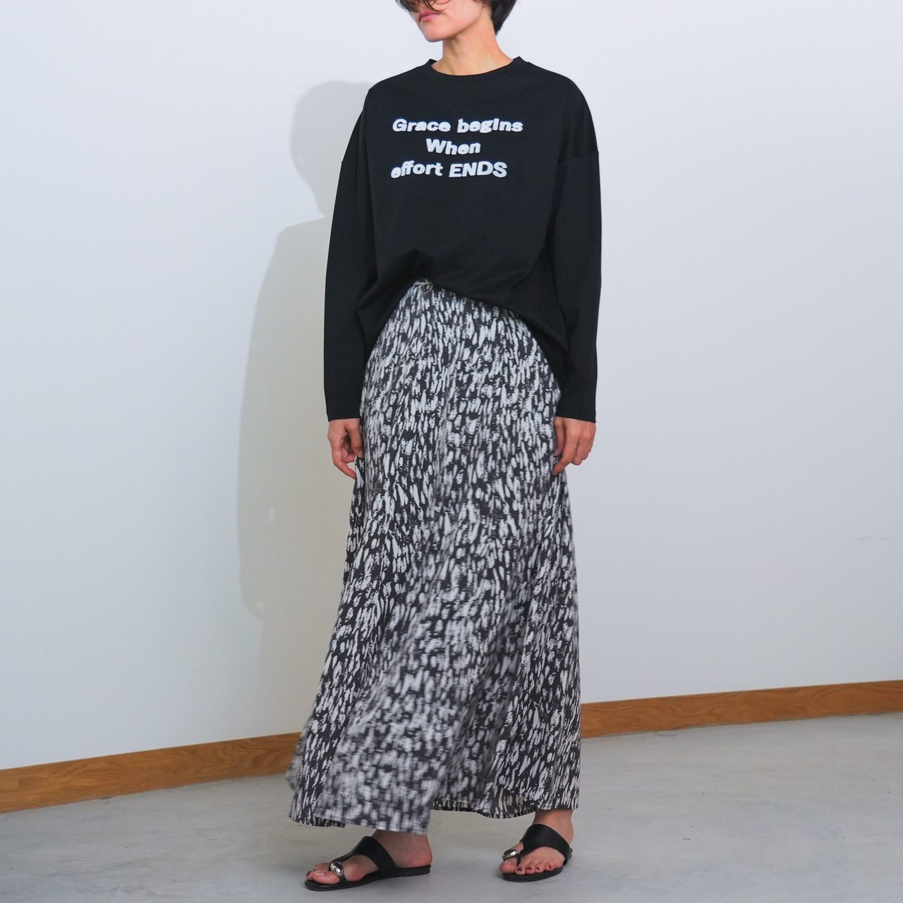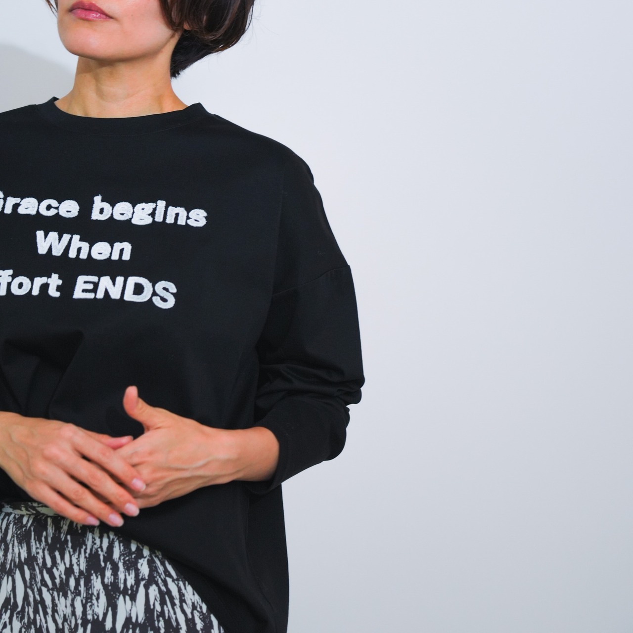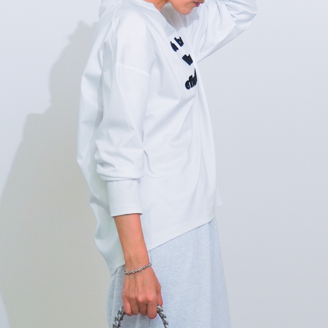 前後差のある着丈と、ゆったりとした身幅・肩幅が身体のラインを拾いにくく、リラックス感のある着心地。
