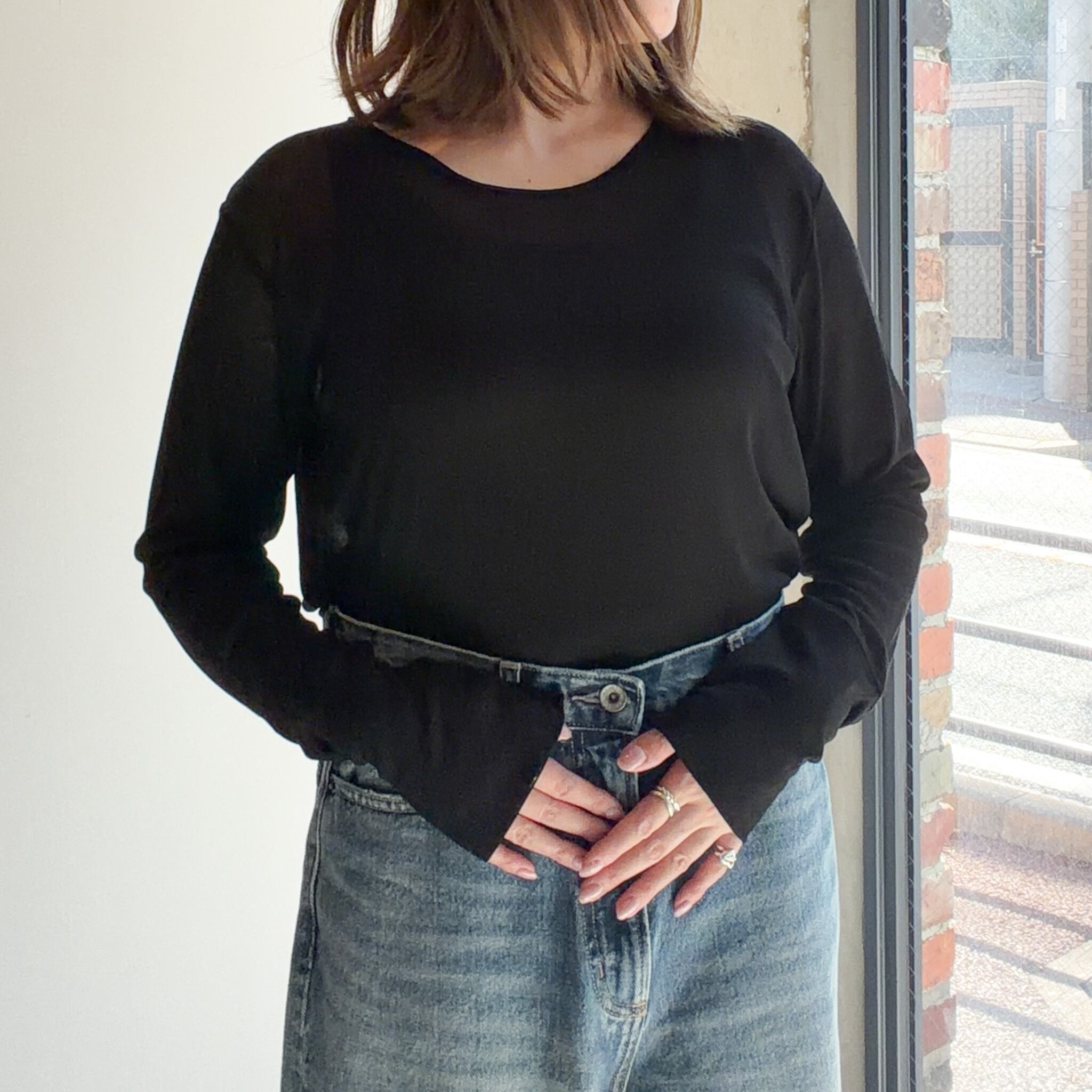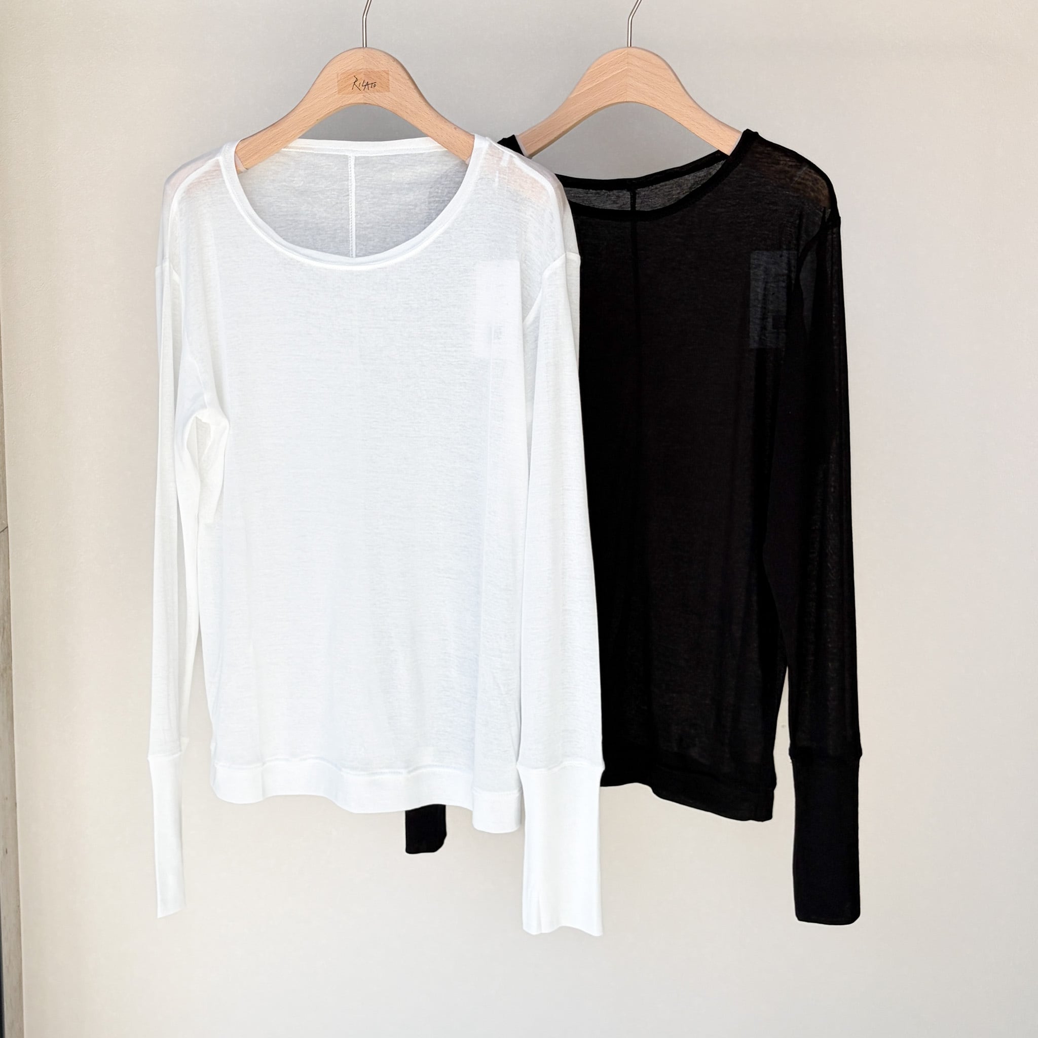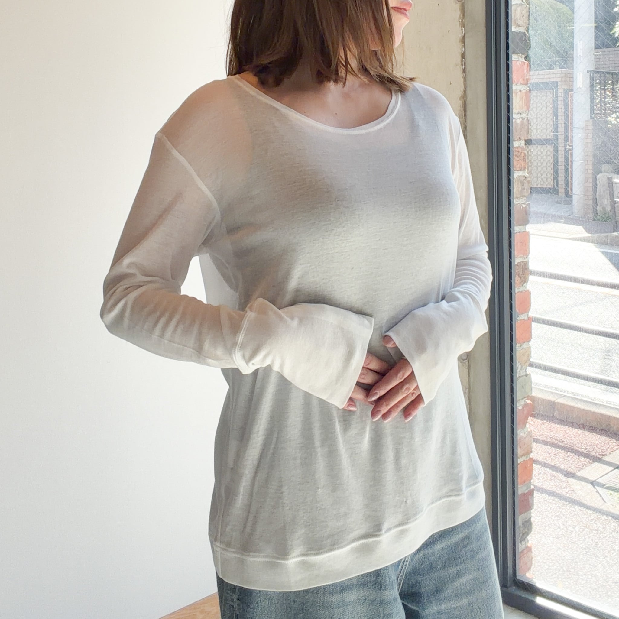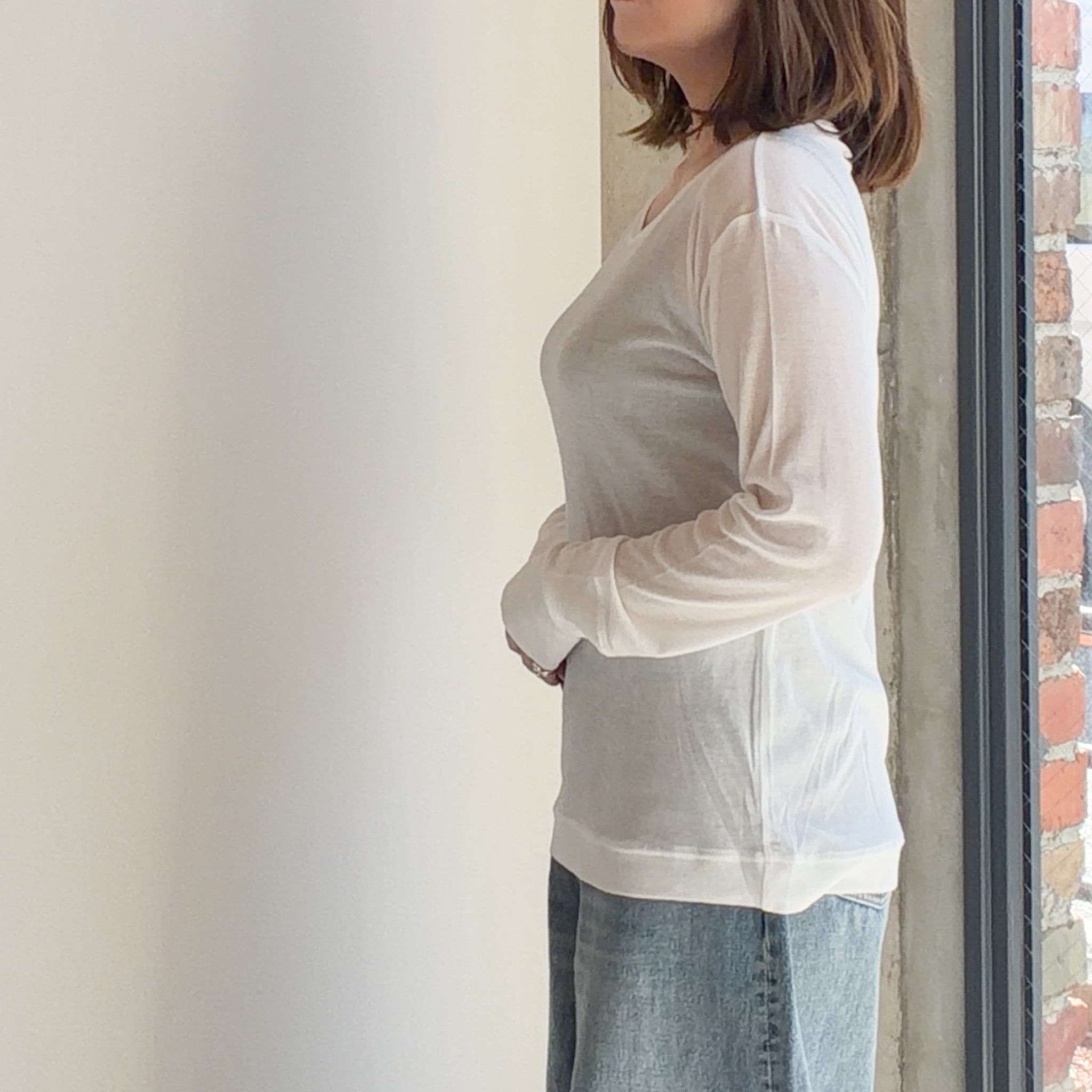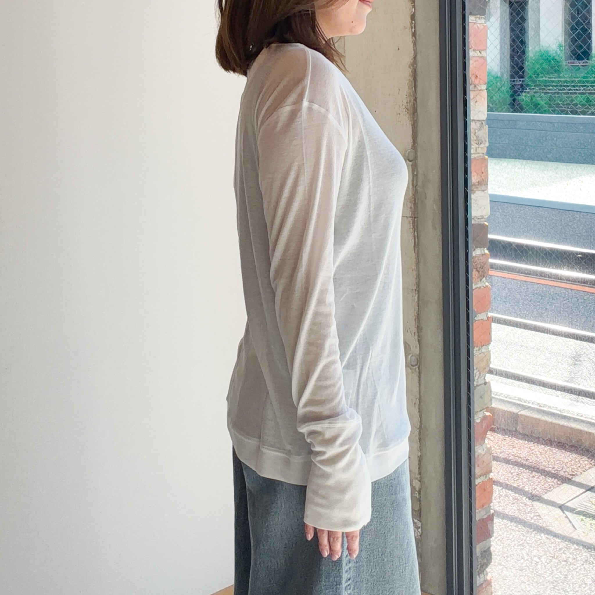 シルエットは、程よいゆとりを持たせたフリーサイズ。ボトムスを選ばずインでもアウトでもバランス良く決まる絶妙な着丈に設計されています。また、袖丈をあえて長めに設定することで、手元に柔らかなニュアンスが生まれ、シンプルながらも洗練された大人の印象を与えてくれます。