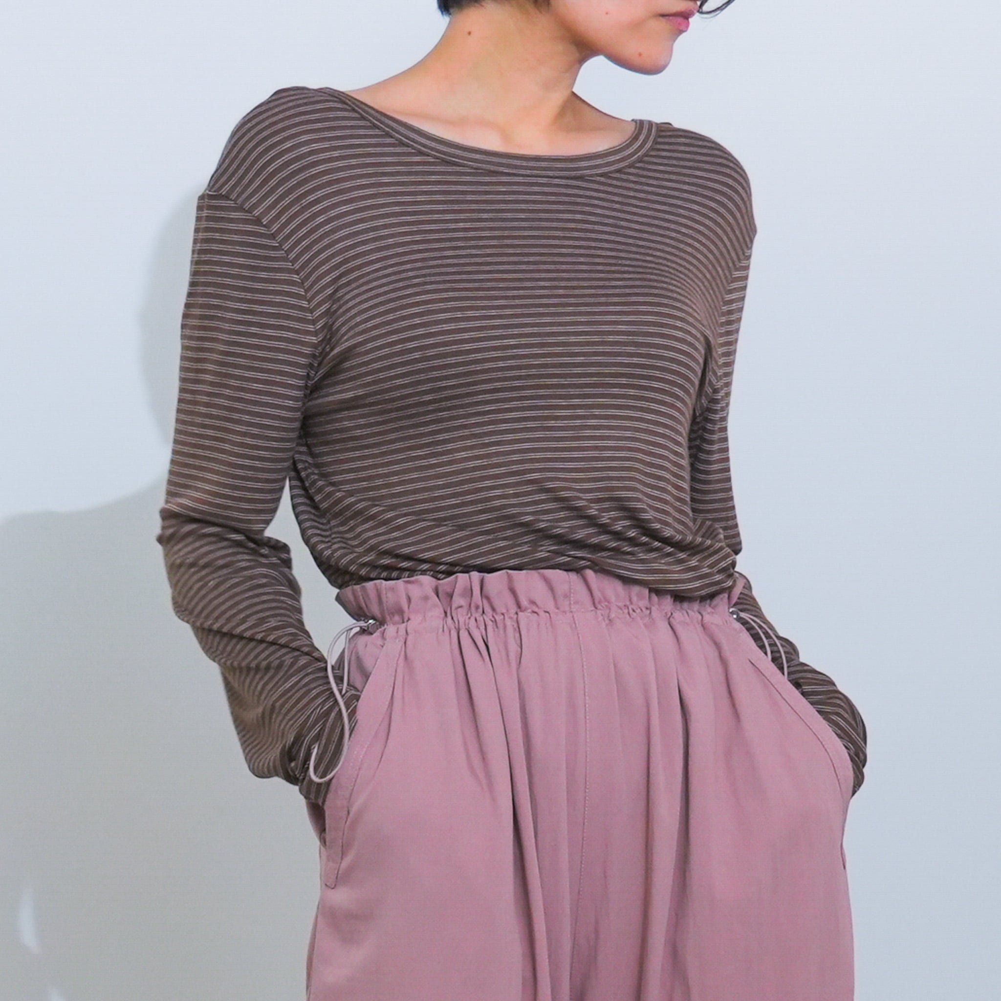 シアー感のある羽織りものを合わせて軽やかな抜け感を出したり、タイトなトップスをインしてメリハリをつけたりと、幅広いスタイリングに馴染む万能なボトムス。さらりとした肌触りで、季節を問わず長く愛用いただけます。