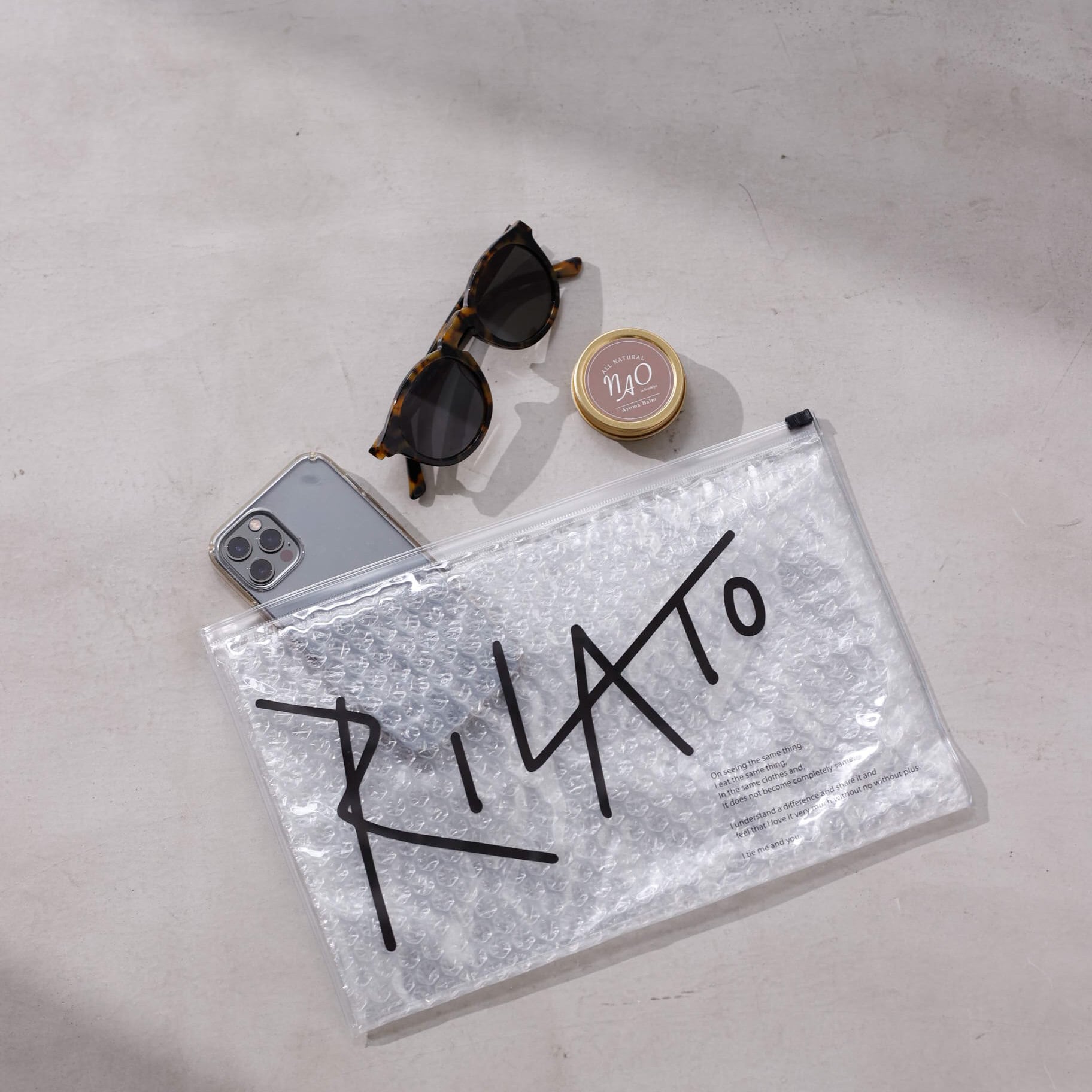 透明のPVCポーチの中にプチプチのクッション材が組み込まれており、壊れるのが不安な大切なアイテムも安心して持ち歩けます。